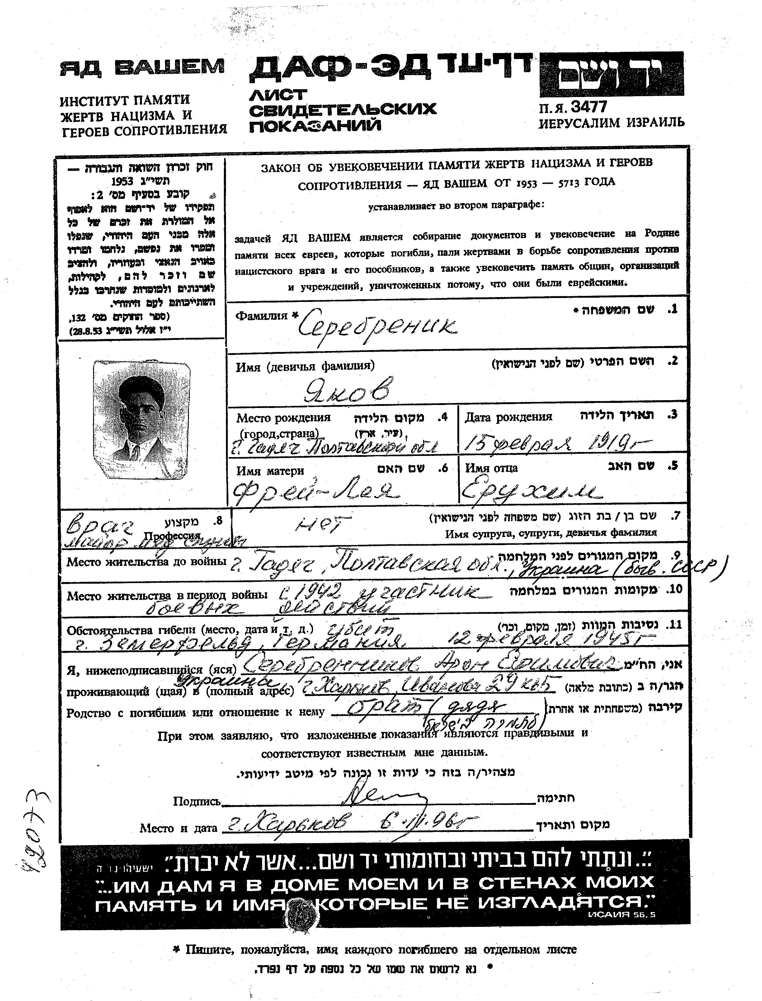 Yakov Serebrenik was born in Gadyach, Ukraine (USSR), 1919. He was a physician. Prior to WWII he lived in Gadyach, Ukraine (USSR). Yakov was killed in military service in WWII. Place of death: the Soviet armed forces, 12/02/1945.
