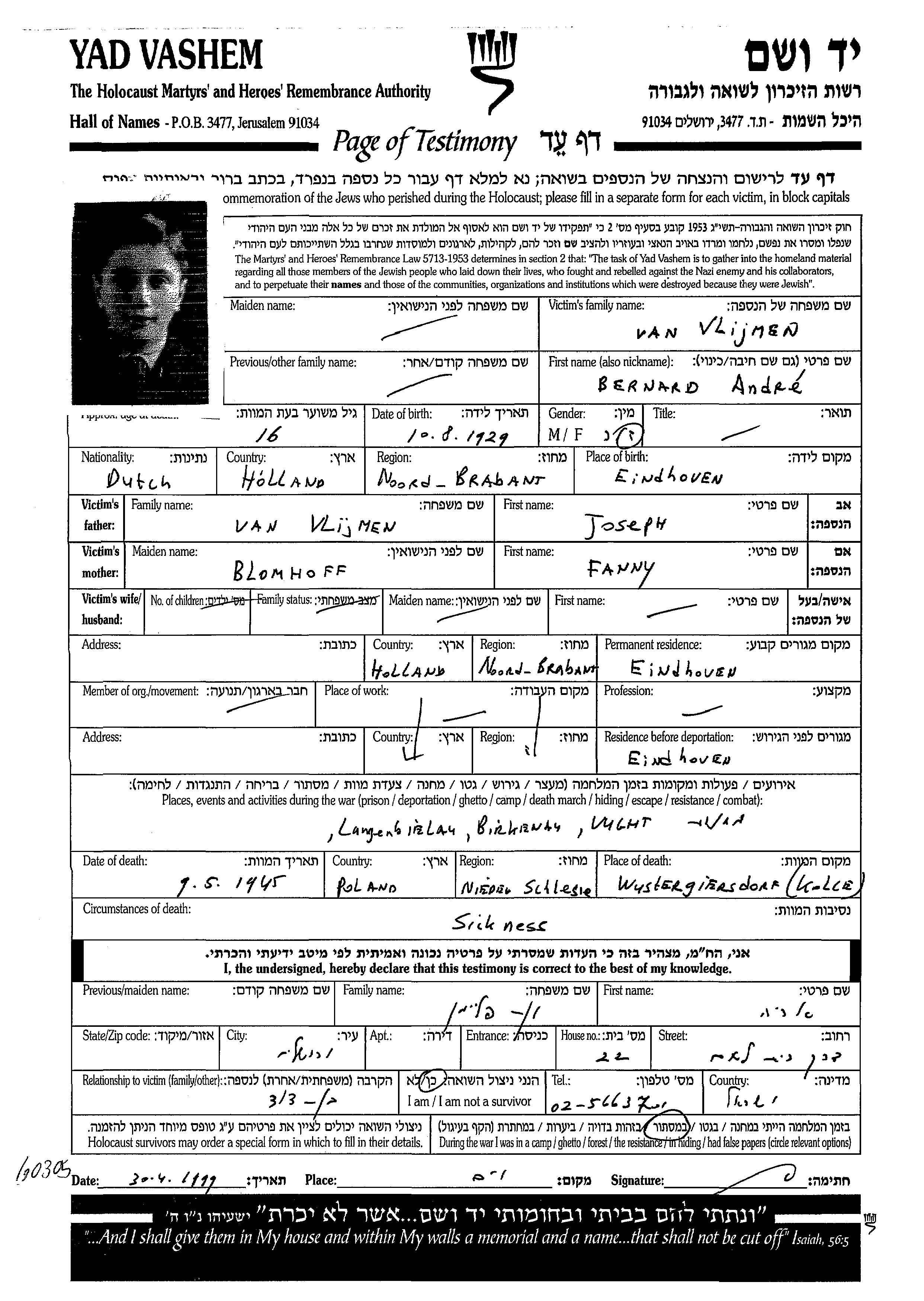 Vlijmen van Bernard Andre 1929 Eindhoven, The Netherlands Page of Testimony