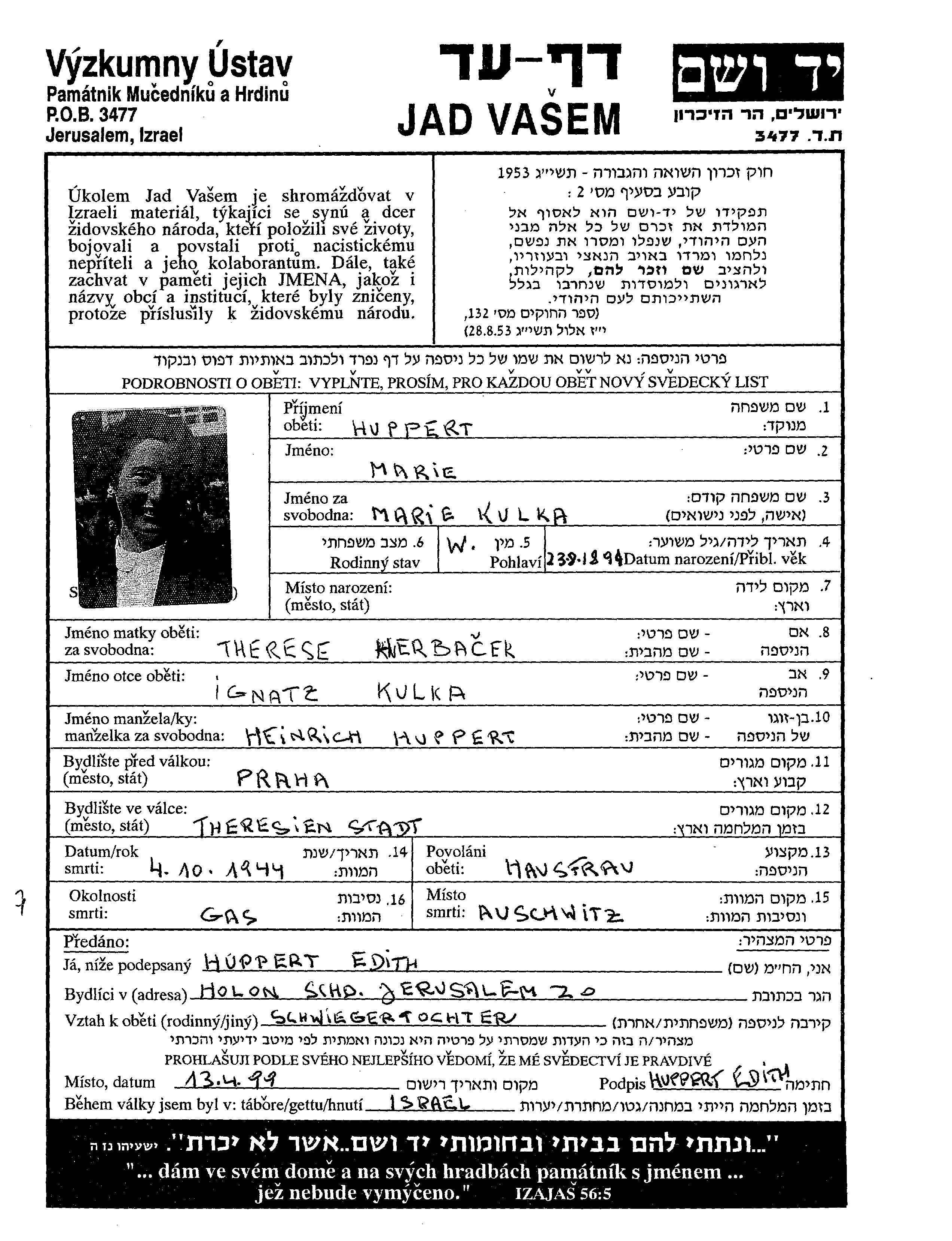 Huppert Marie 1894 Praha, Czechoslovakia Page of Testimony