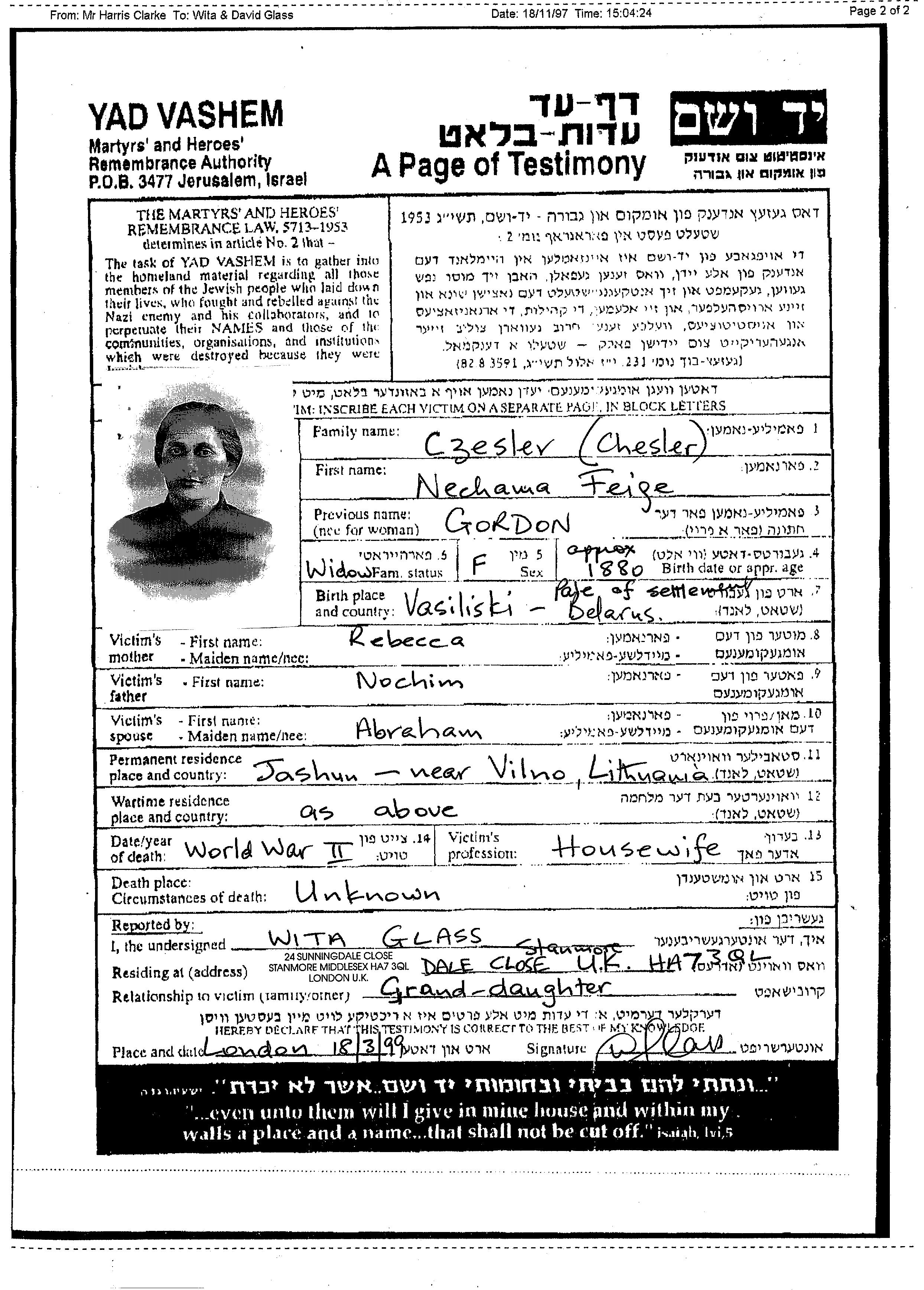Nechama Feiga Czesler nee Gordon was born in Wasiliszki, Poland, 1880. She was a housewife. Prior to WWII she lived in Jaszuny, Poland. Nechama Feiga was murdered in the Shoah. Place of death: unstated place.