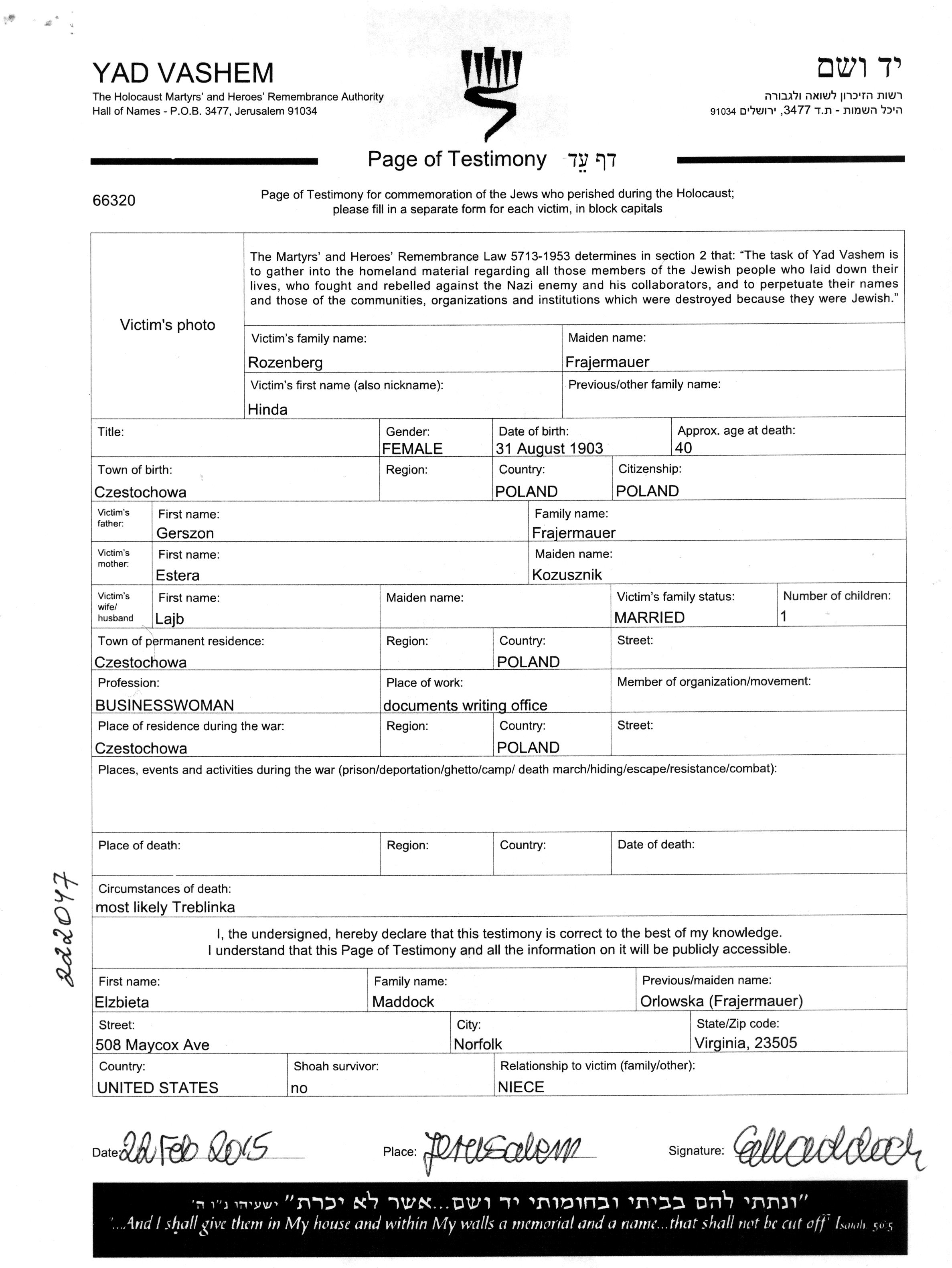 Rozenberg Hinda 1903 Czestochowa, Poland Page of Testimony (digital signed)