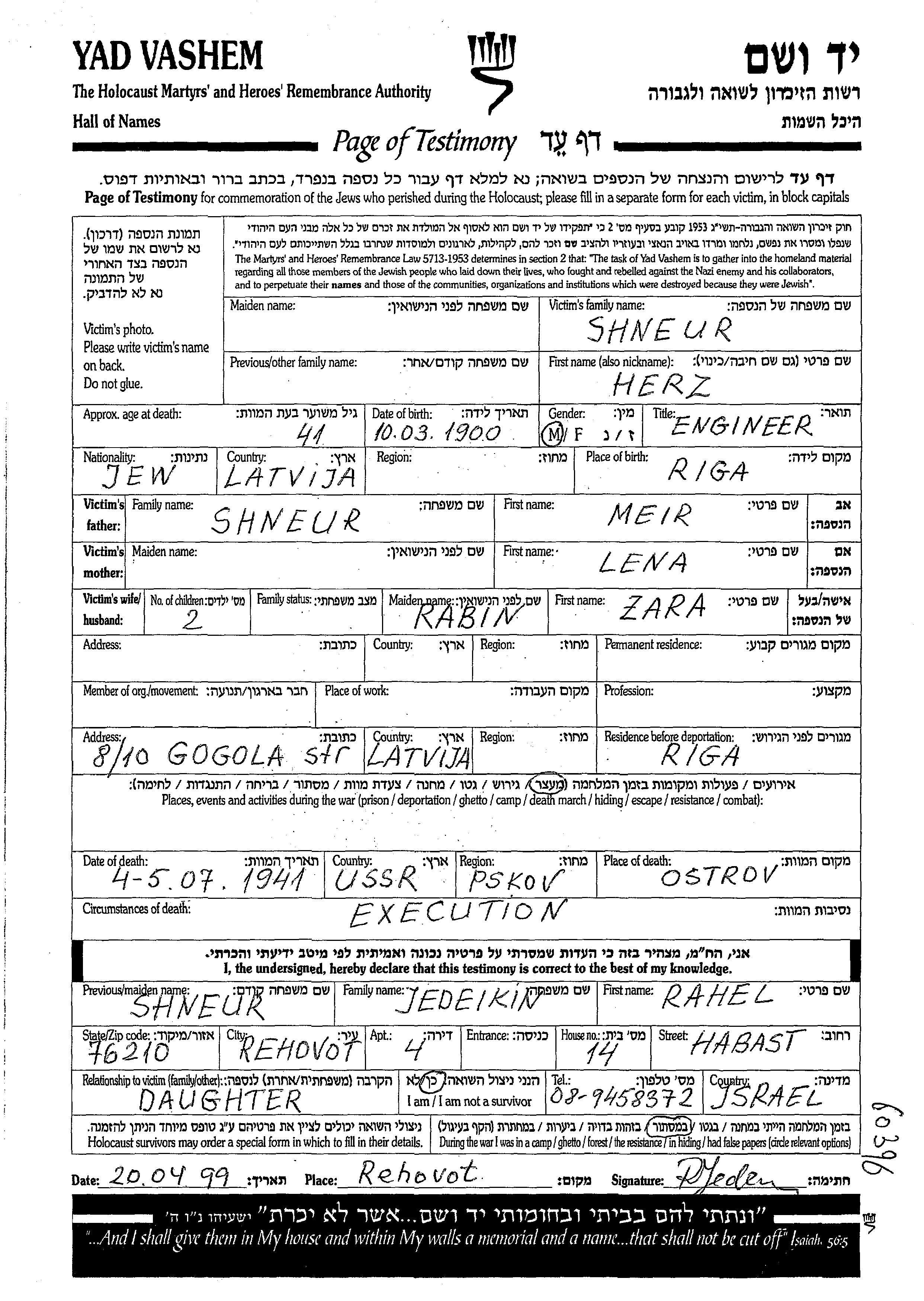 | Shneur | Herz | 1900 | unstated place, | Page of Testimony |