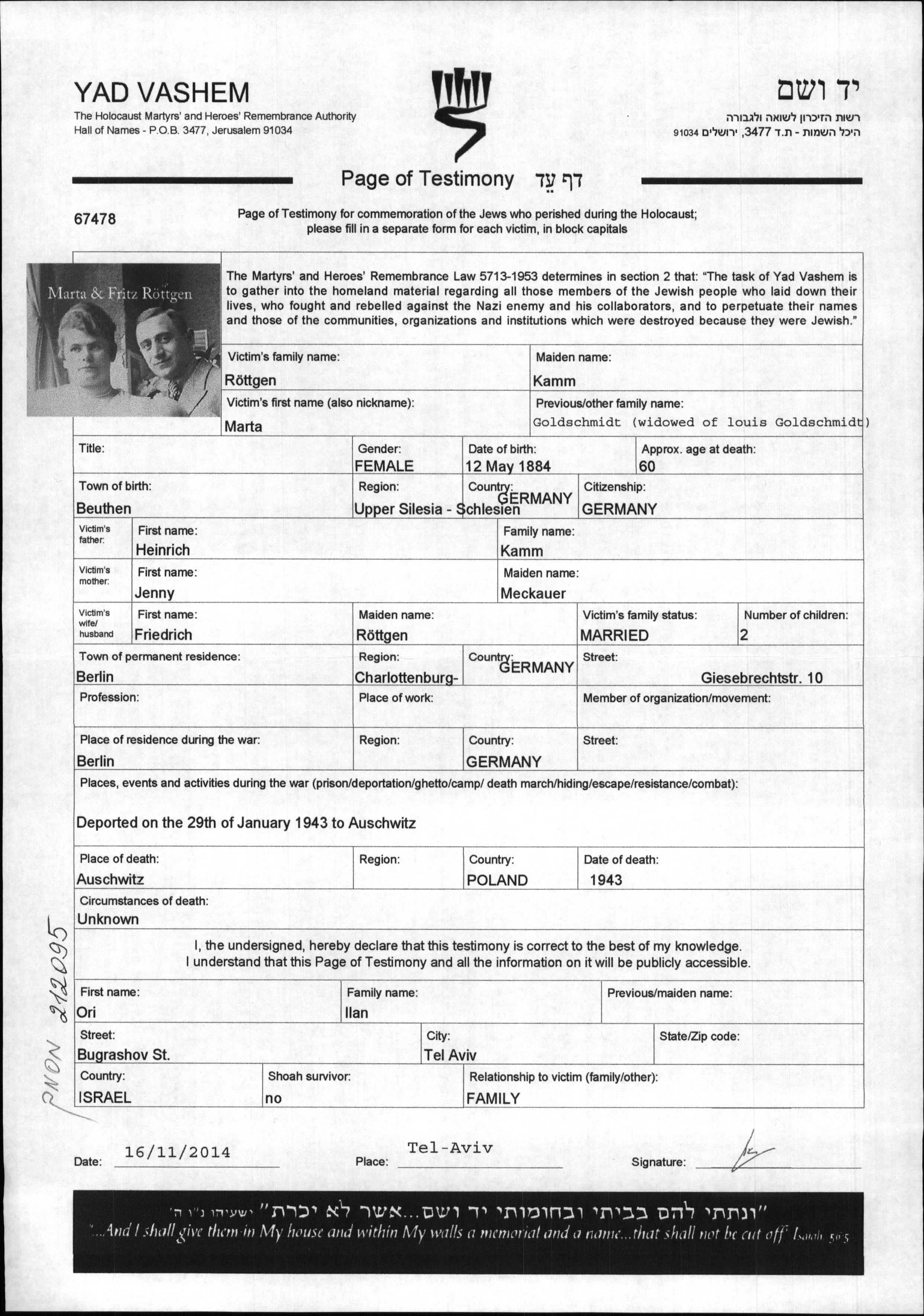 Roettgen Marta 1884 Berlin, Germany Page of Testimony