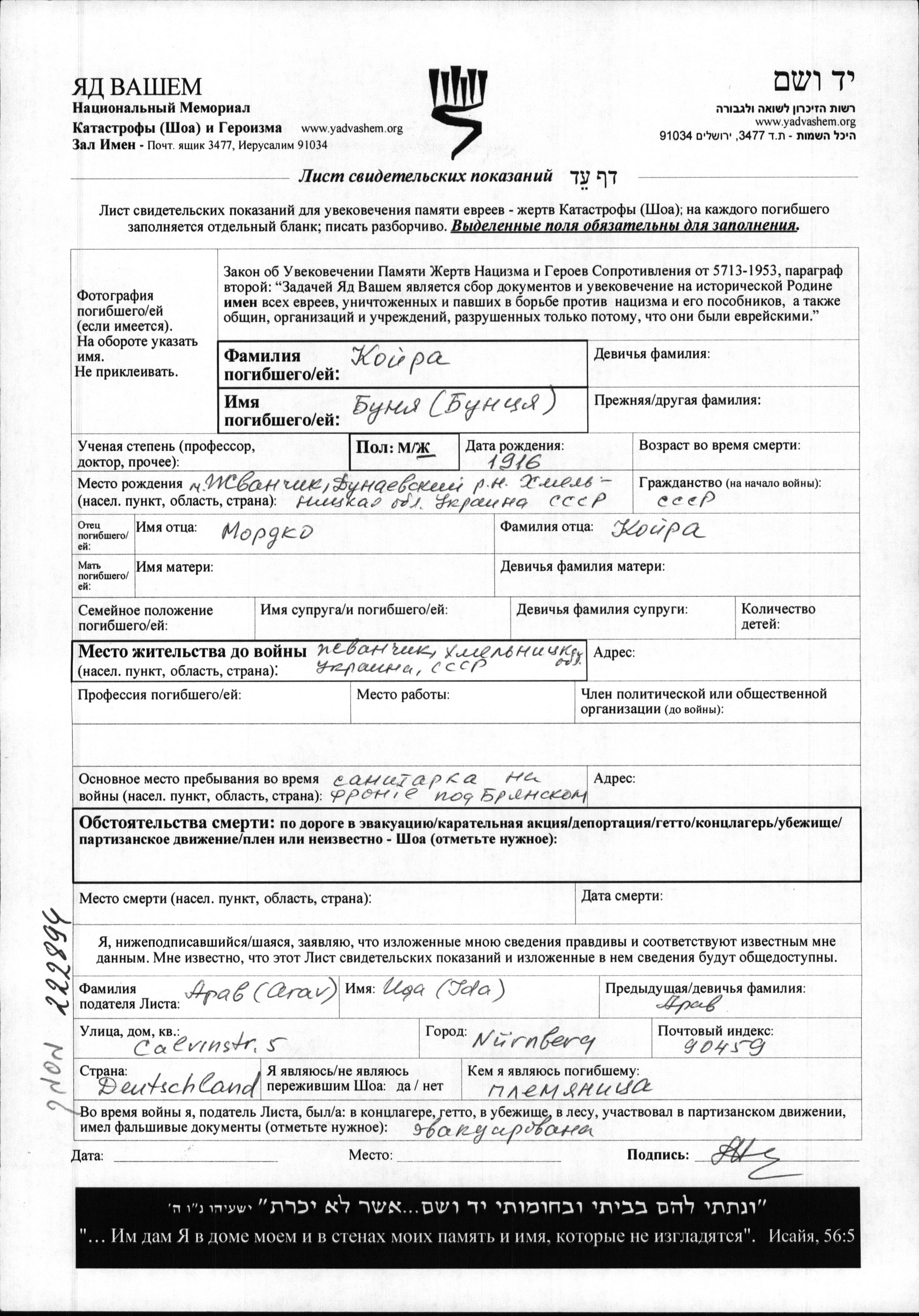Bunya Koyra was born in Velikiy Zhvanchik, Ukraine (USSR), 1916. Prior to WWII she lived in Velikiy Zhvanchik, Ukraine (USSR). Bunya was killed in military service in WWII. Place of death: unstated place.