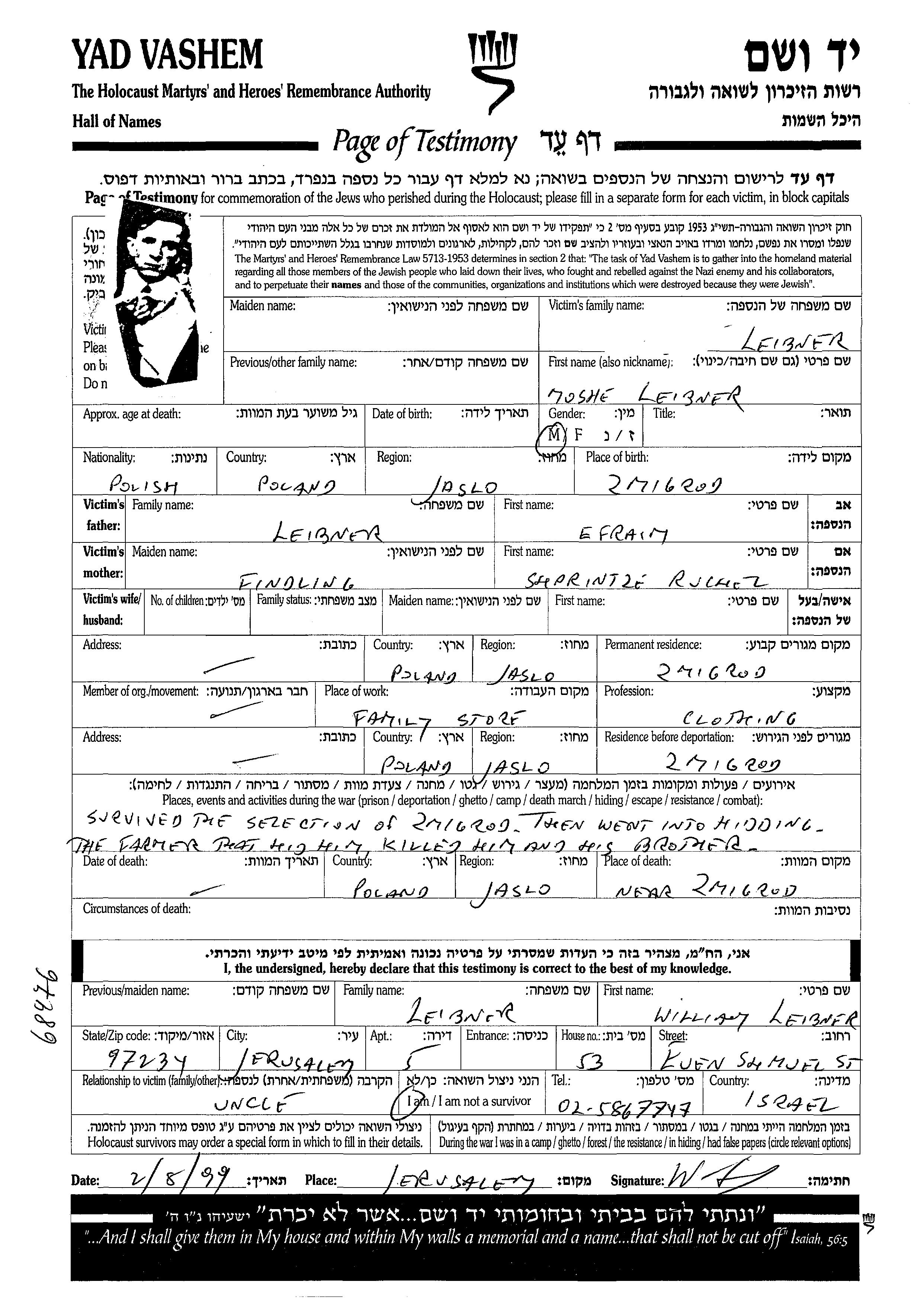 Leibner Moshe Zmigrod, Poland Page of Testimony