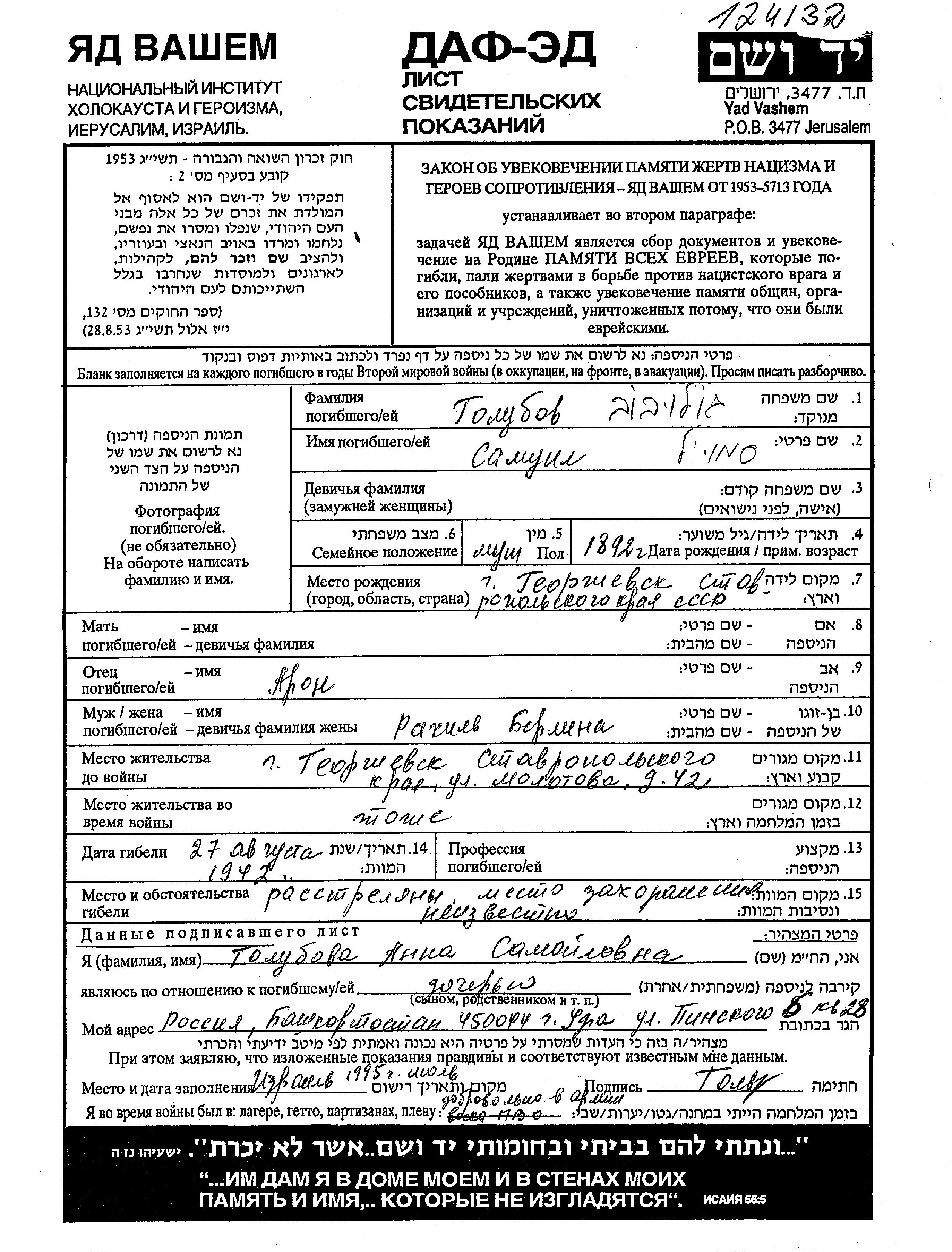 Samuil Golubov was born in Georgiyevsk, Russia (USSR), 1892. Prior to WWII he lived in Georgiyevsk, Russia (USSR). Samuil was murdered in the Shoah. Place of death: unstated place, 27/08/1942.