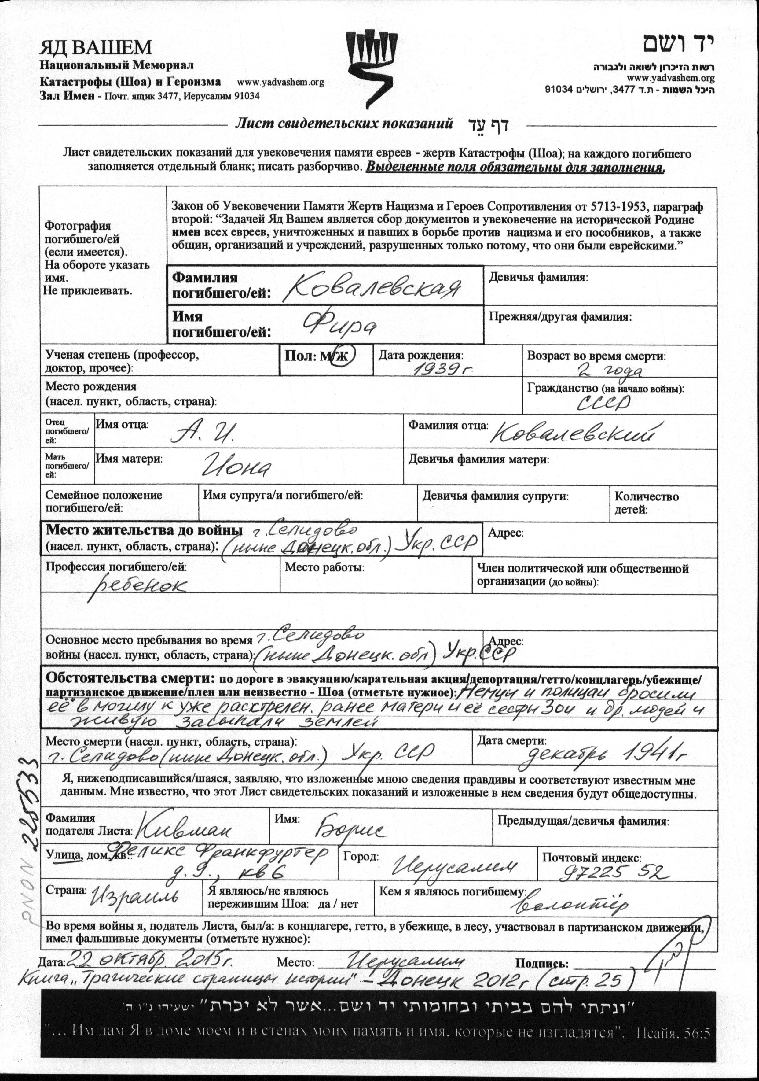 Kovalevskaya Fira 1939 Selidovo, Ukraine (USSR) Page of Testimony