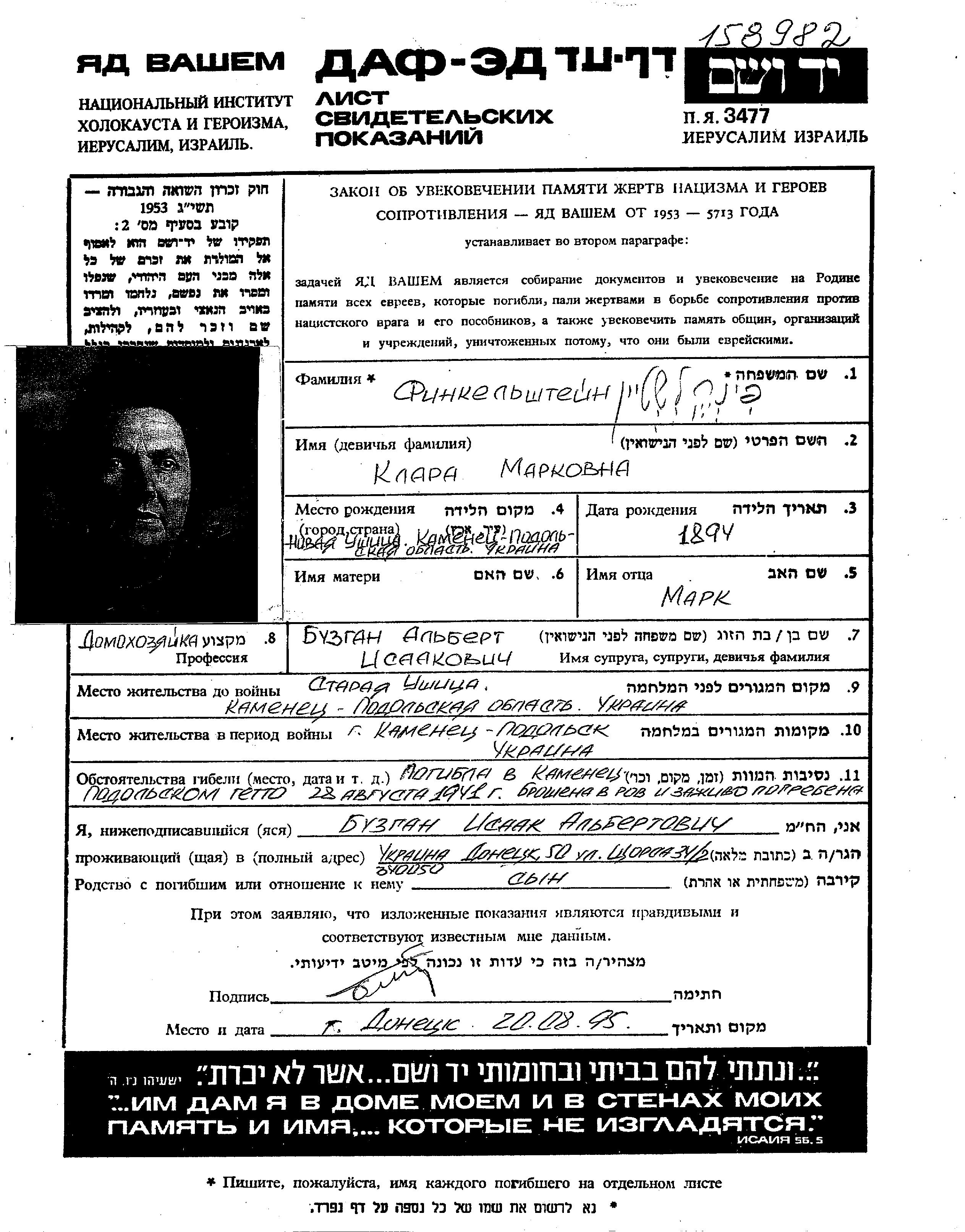 Klara Finkelshtein nee Finkelshtein was born in Novaya Ushitsa, Ukraine (USSR), 1894. She was a housewife. Prior to WWII she lived in Staraya Ushitsa, Ukraine (USSR). Klara was murdered in the Shoah. Place of death: Kamenets Podolsk, Ukraine (USSR), 28/08/1941.