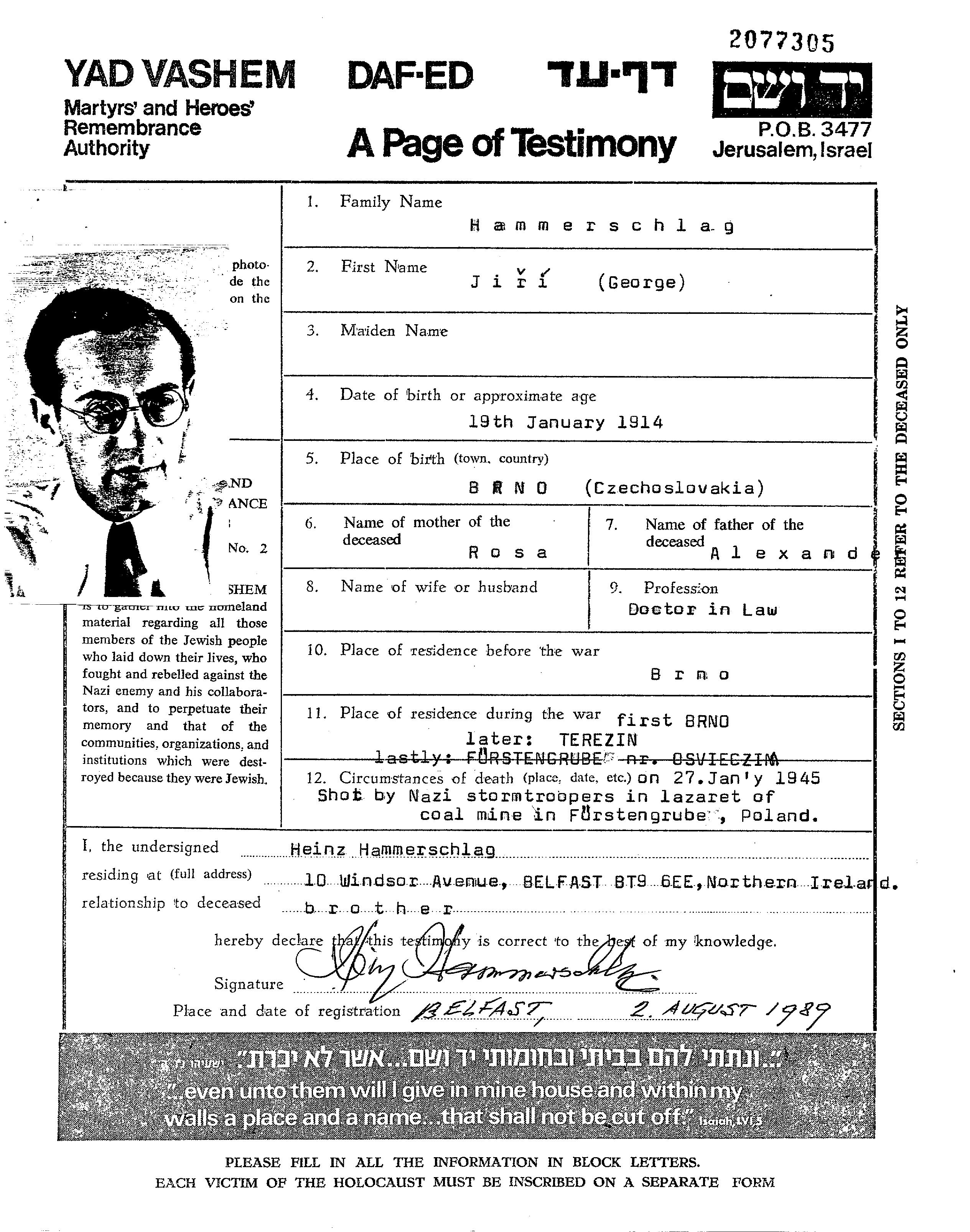 Jiri George Hammerschlag was born in Brno, Czechoslovakia, 1914. He was a jurist. Prior to WWII he lived in Brno, Czechoslovakia. Jiri George was murdered in the Shoah. Place of death: Wesola, Poland, 27/01/1945.