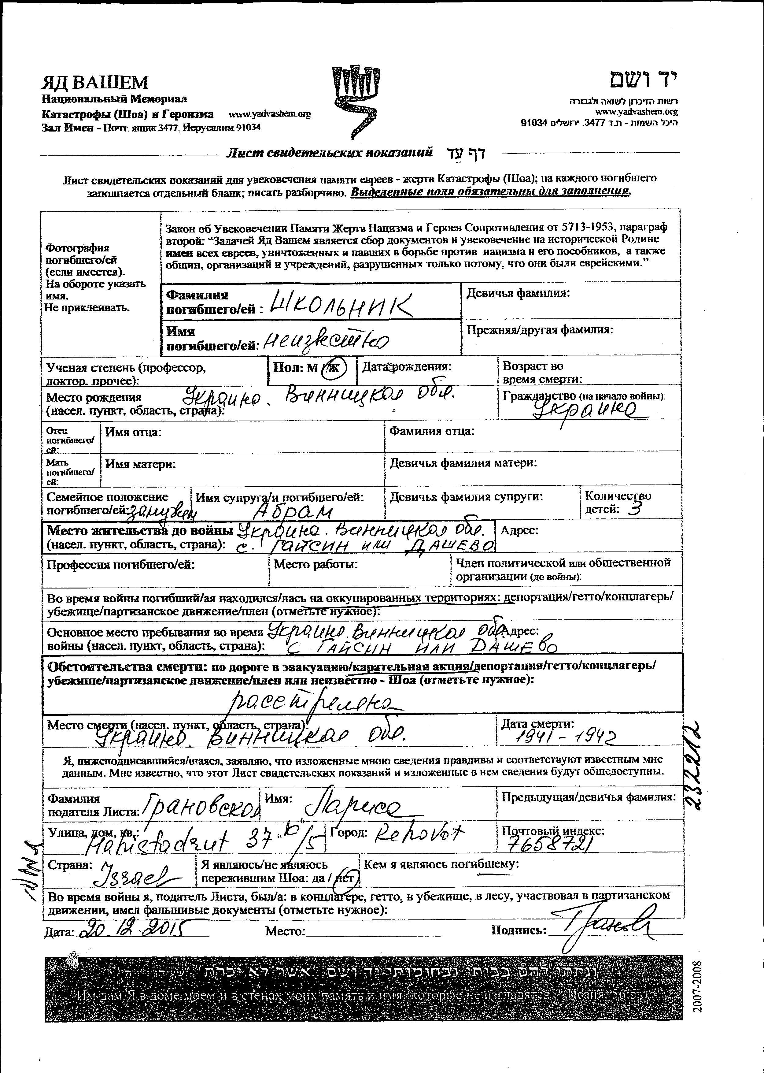 | Shkolnik | First name unknown | Gaysin, Ukraine (USSR) | Page of Testimony | |