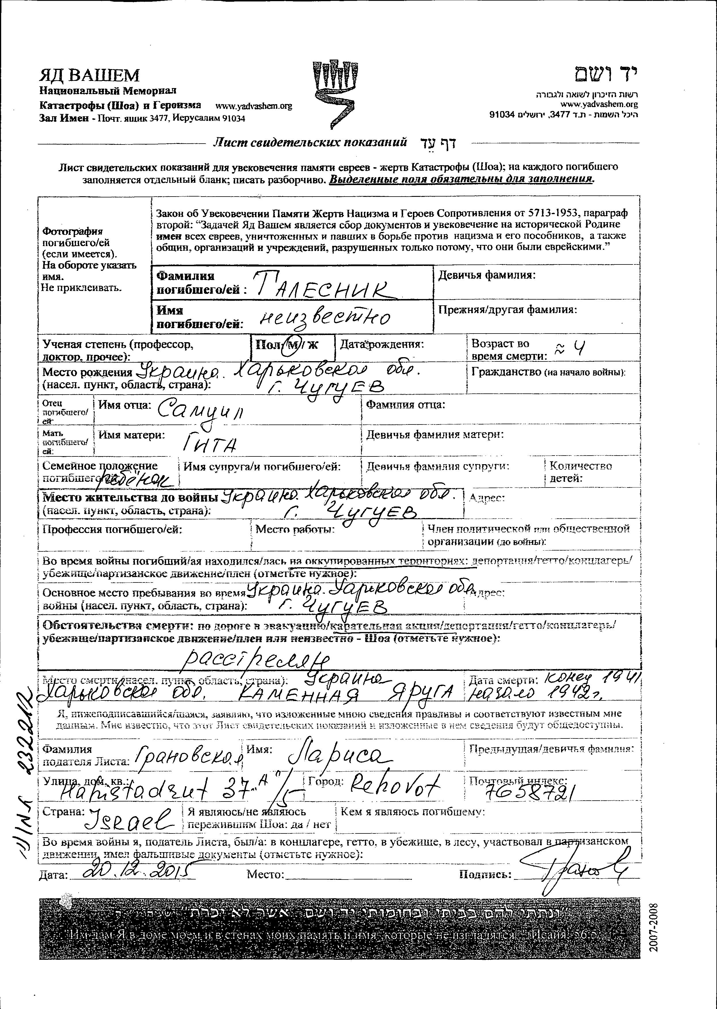 First name unknown Talesnik was born in Chuguyev, Ukraine (USSR). Prior to WWII he lived in Chuguyev, Ukraine (USSR).