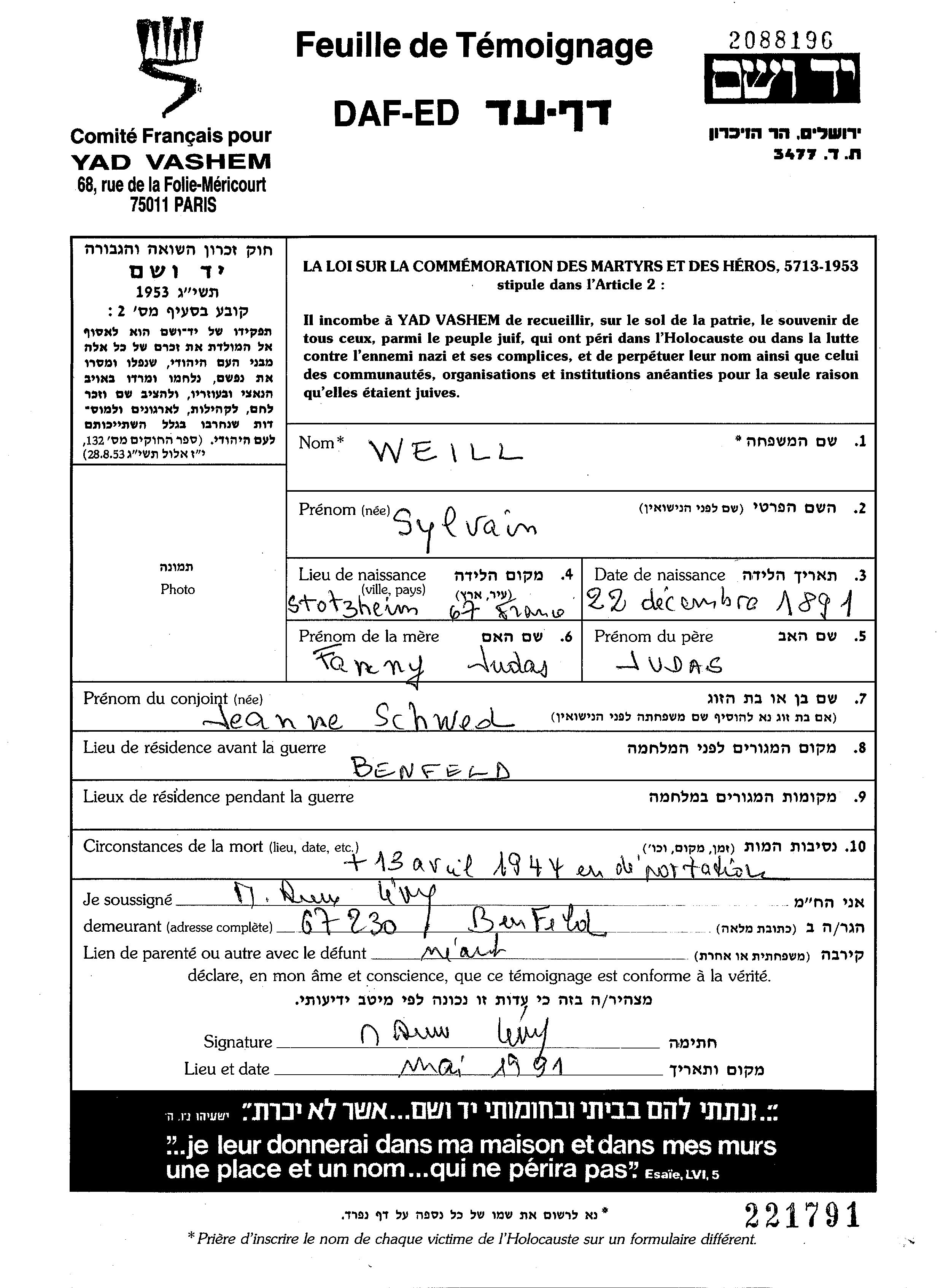 Sylvain Weill Judas was born in Stotzheim, France, 1891 to Fanny nee Judas. He was married to Jeanne Zhan. Prior to WWII he lived in Benfeld, France. Sylvain was murdered in the Shoah.