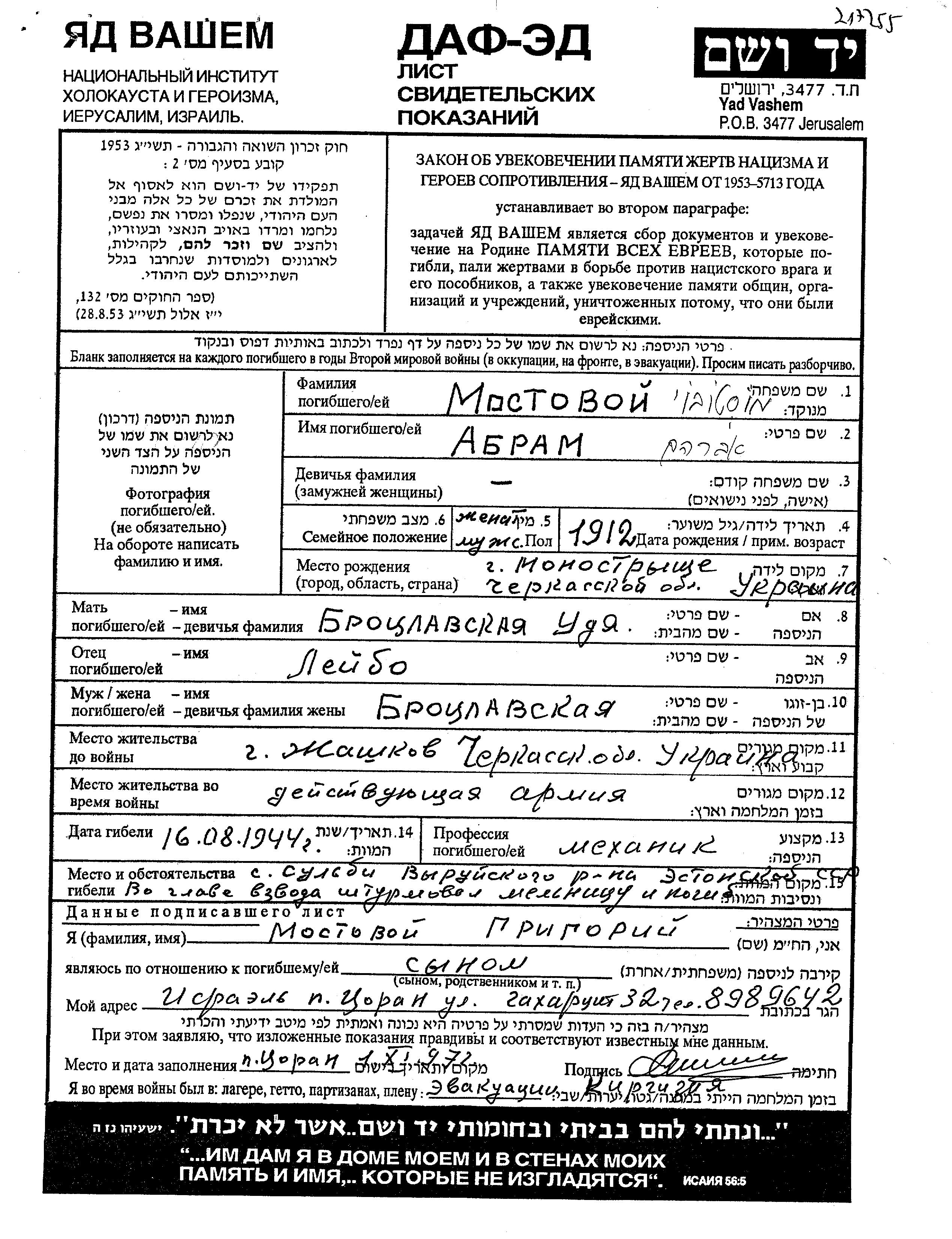 Mostovoi | Abram | 1912 | Zhashkov, Ukraine (USSR) | Page of Testimony |
