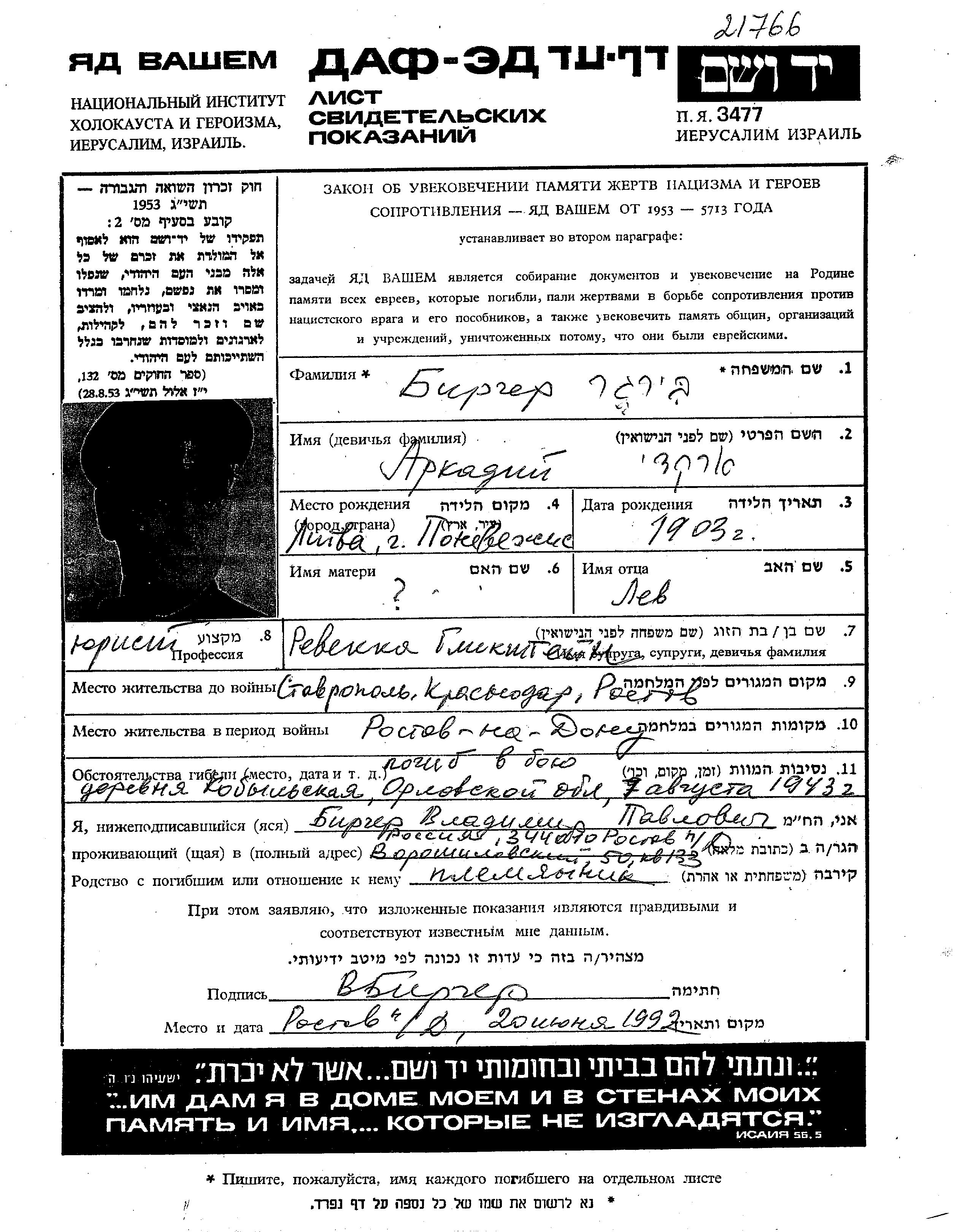 Arkadi Birger was born in Panevėžys, Lithuania, 1903. He was a jurist. Prior to WWII he lived in Voroshilovsk, Russia (USSR).