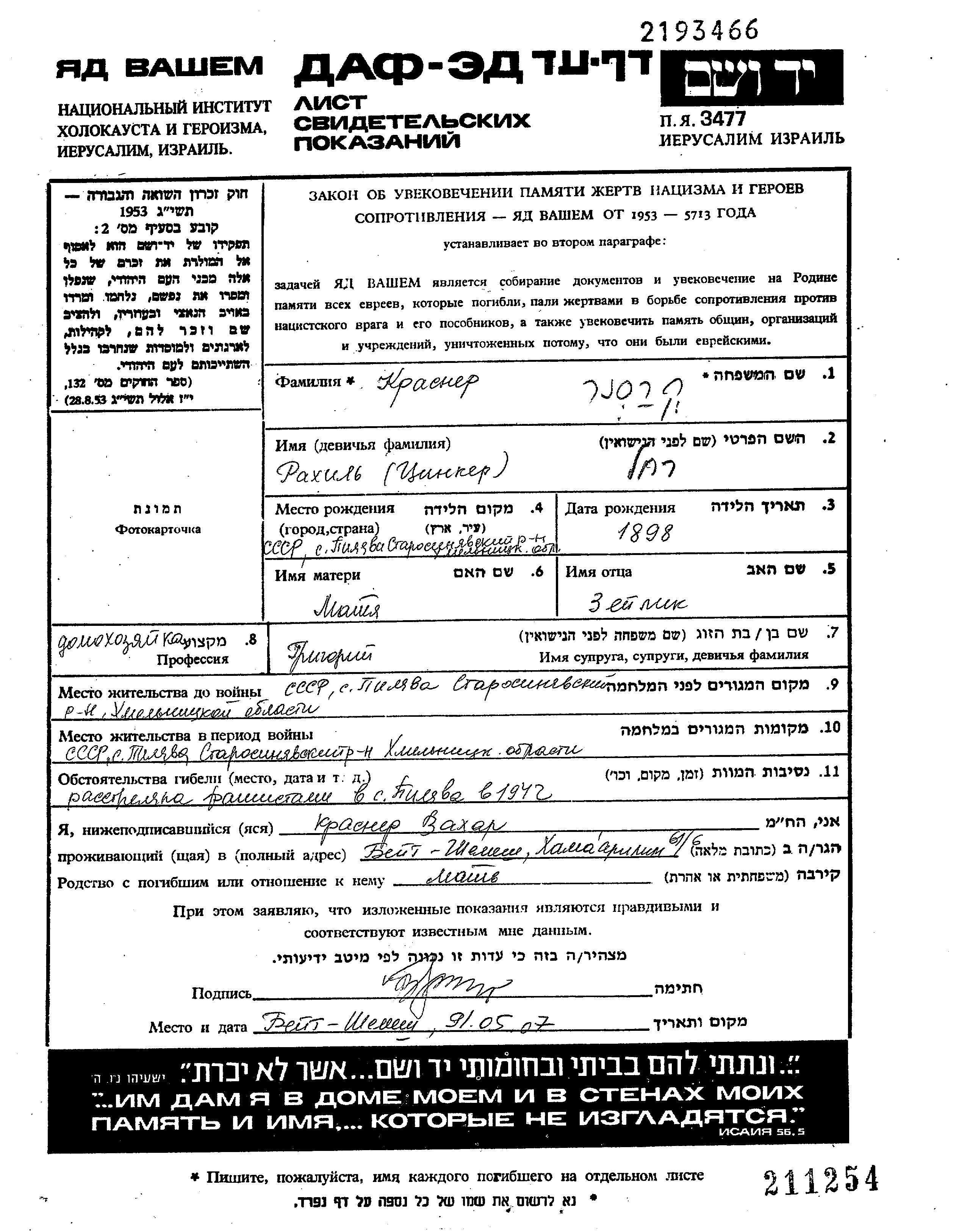 Krasner Kersner Rakhil 1898 Pilyava, Ukraine (USSR) Page of Testimony