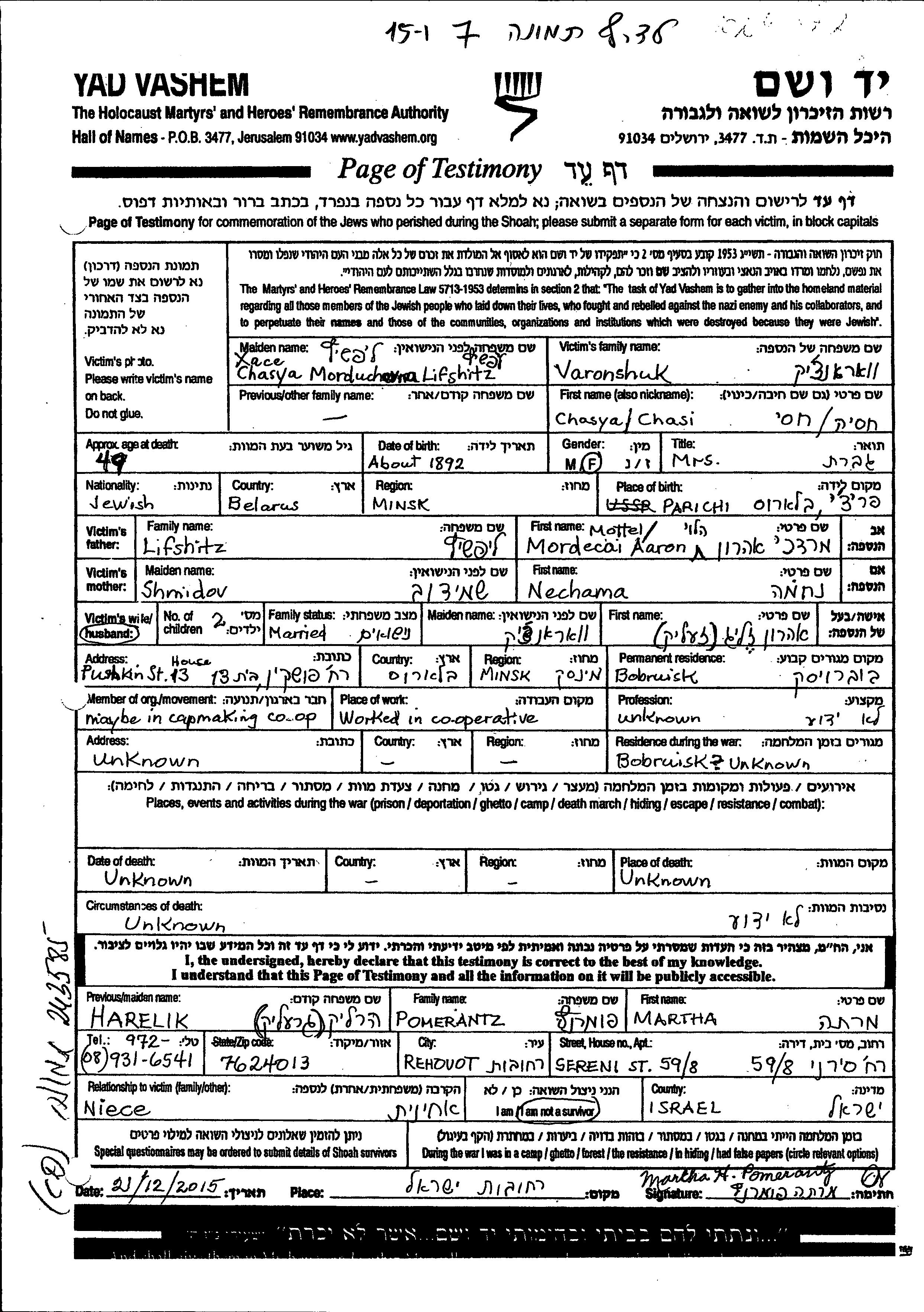 | Varonchuk | Chasya Chasi | 1892 | Bobruysk, Belorussia (USSR) | Page of Testimony |