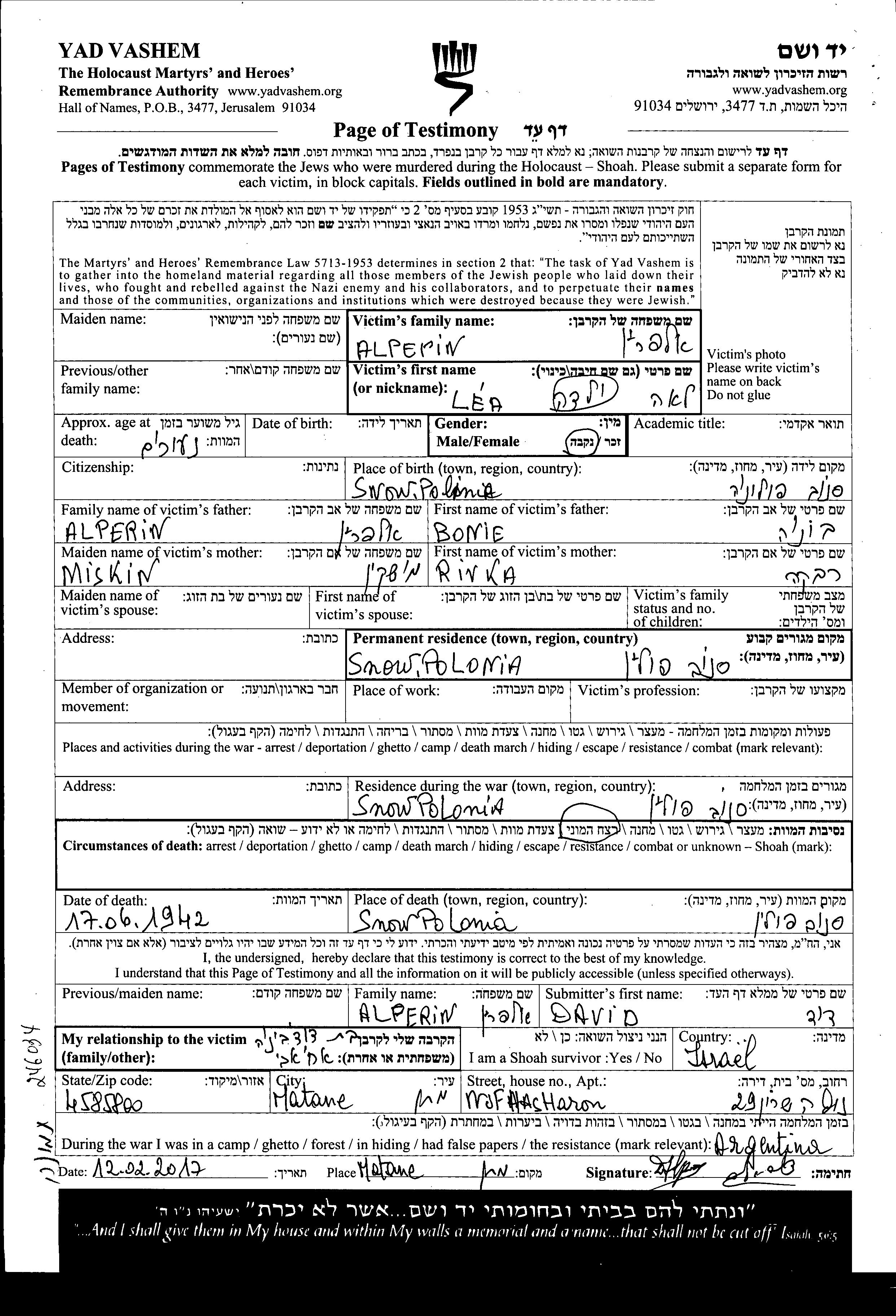 Alperin Léa Snow, Poland Page of Testimony
