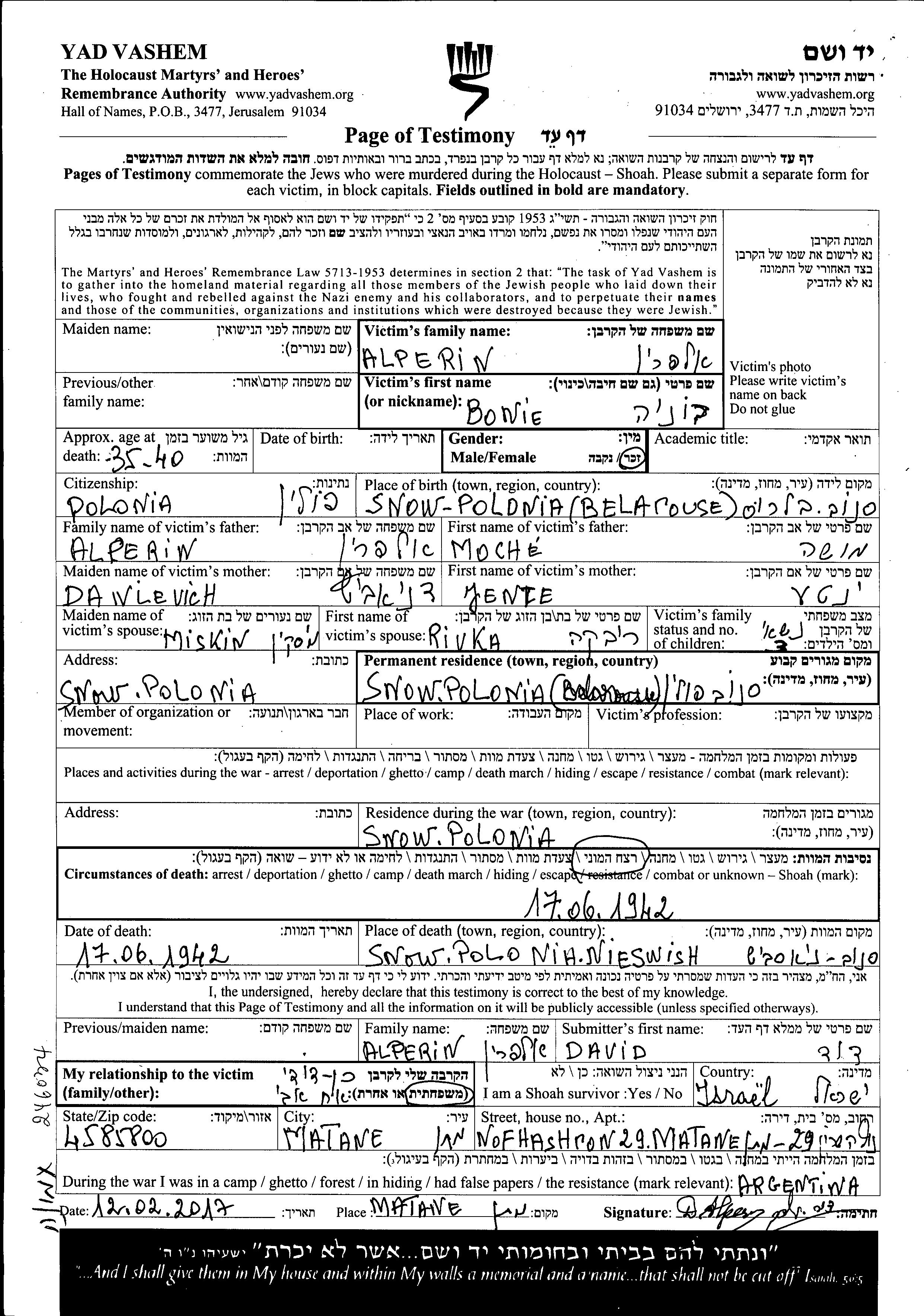 | Alperin | Bonie Bunia | Snow, Poland | Page of Testimony | |