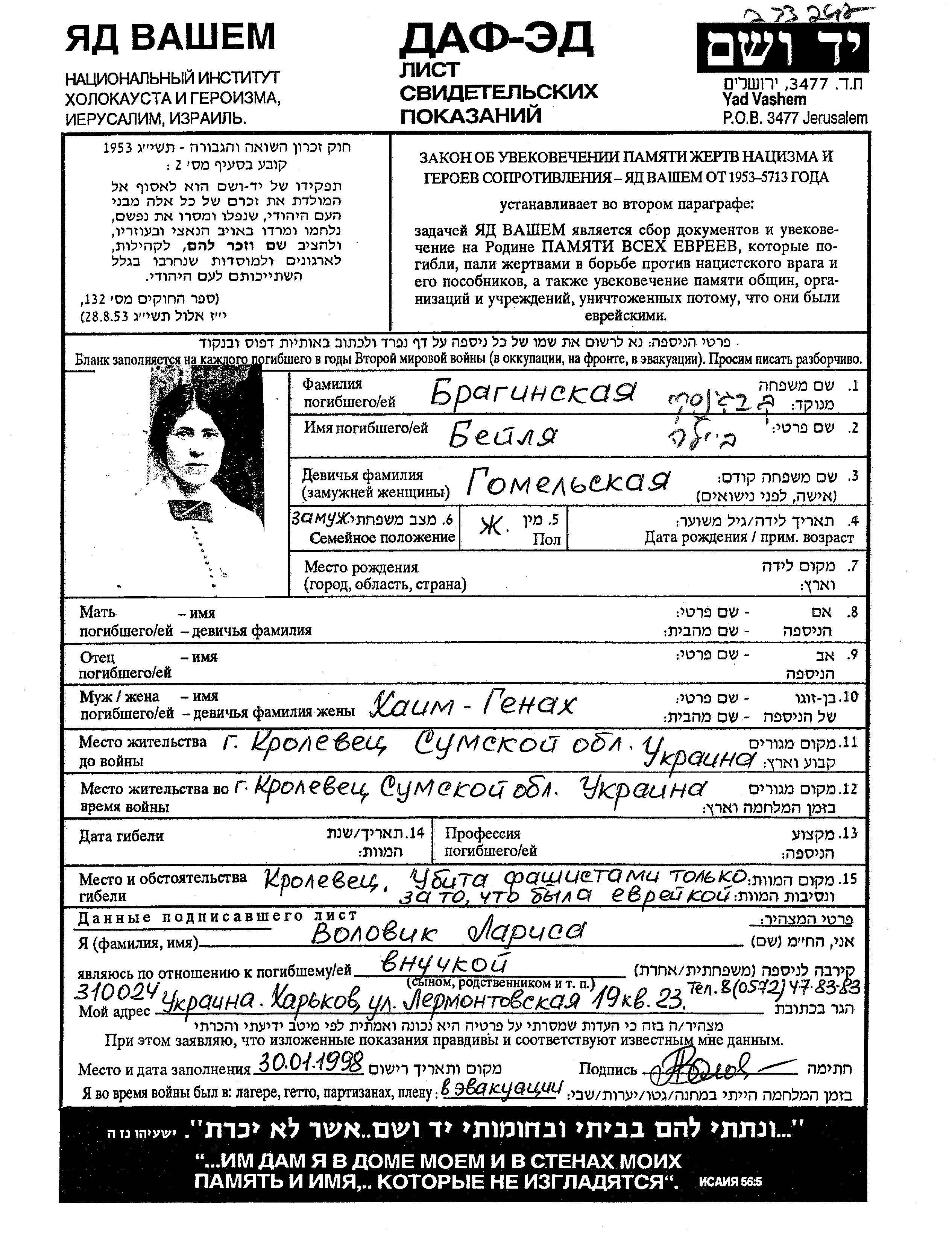 Braginski Berginski Beilya Krolevets, Ukraine (USSR) Page of Testimony