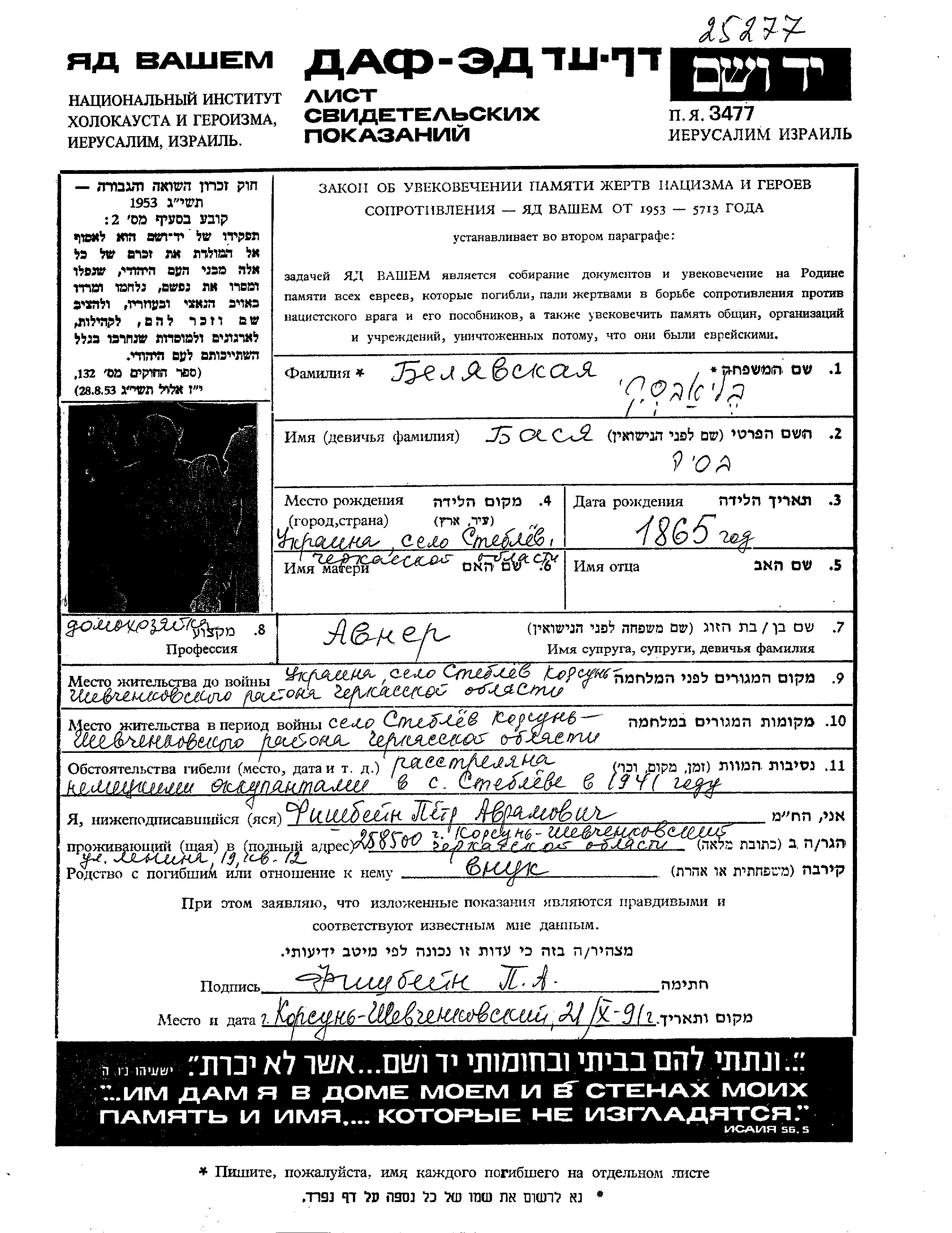 Basia Belyavski was born in Steblev, Ukraine (USSR), 1865. She was a housewife. Prior to WWII she lived in Steblev, Ukraine (USSR). Basia was murdered in the Shoah. Place of death: Steblev, Ukraine (USSR), 1941.