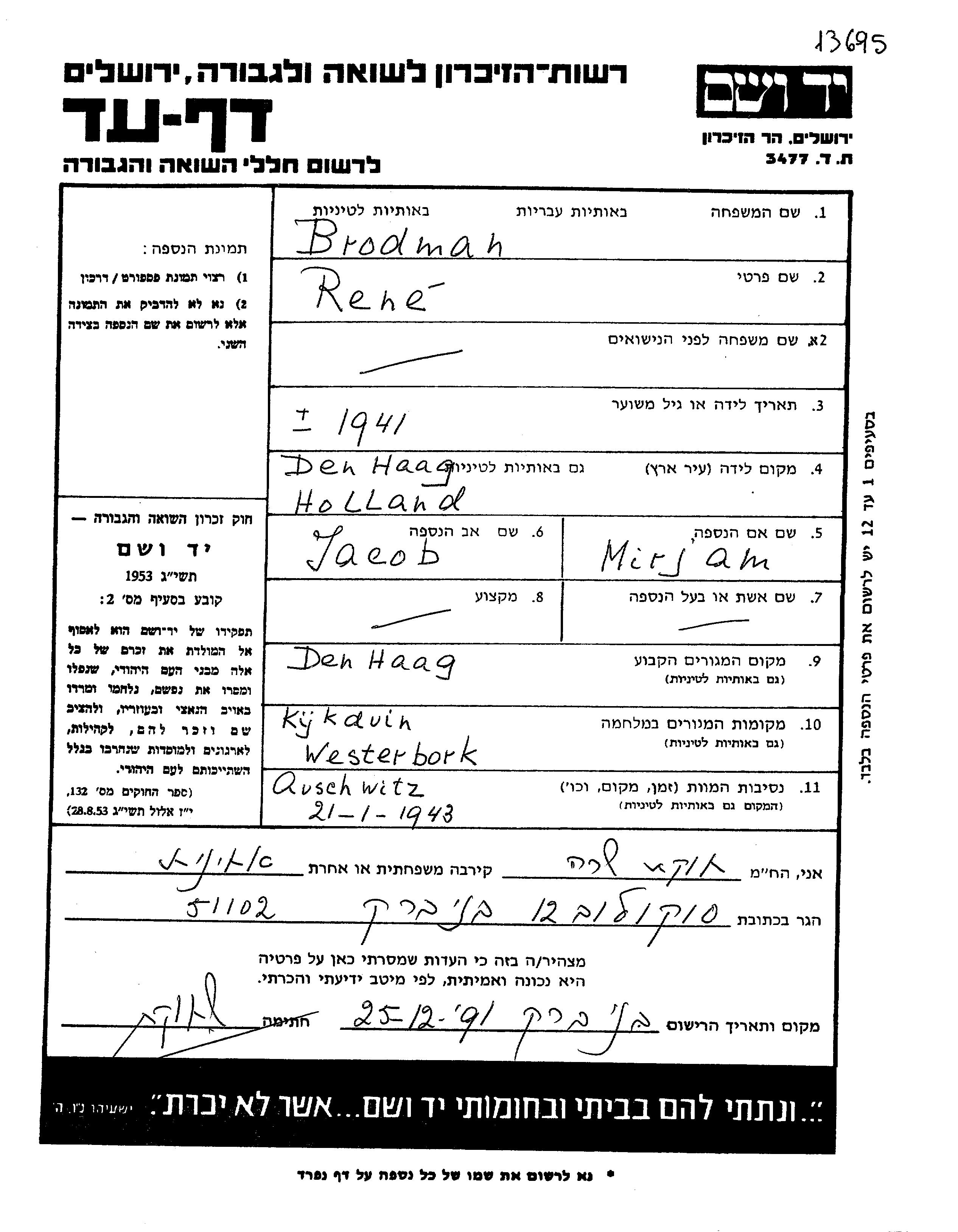 Brodman Rene 1941 The Hague, The Netherlands Page of Testimony