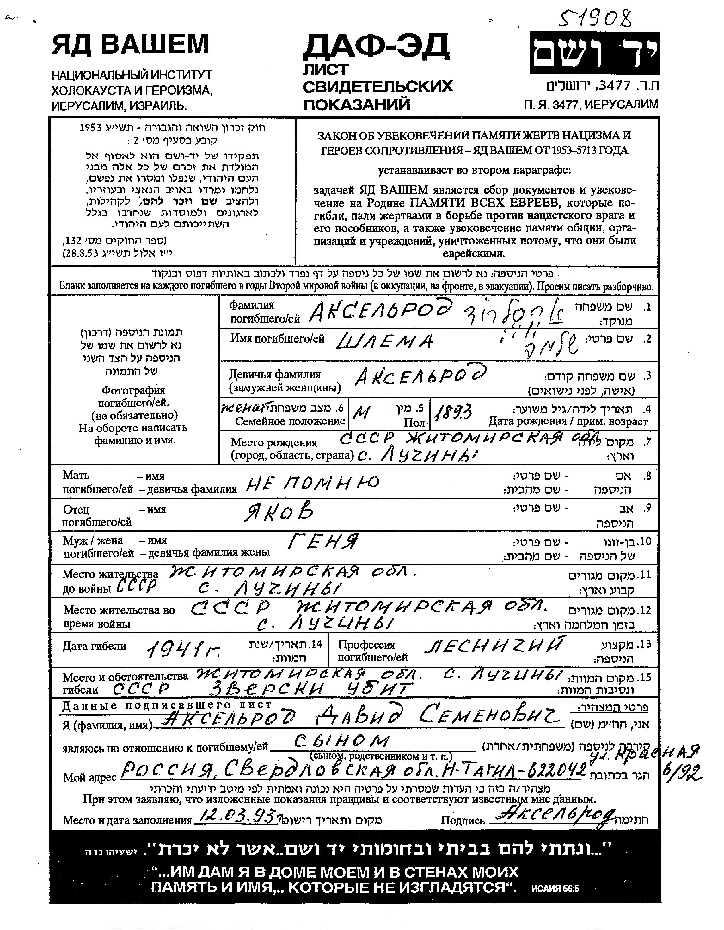 Shlema Akselrod was born in Luginy, Ukraine (USSR), 1893. He was a forester. Prior to WWII he lived in Luginy, Ukraine (USSR). Shlema was murdered in the Shoah. Place of death: Luginy, Ukraine (USSR), 1941.