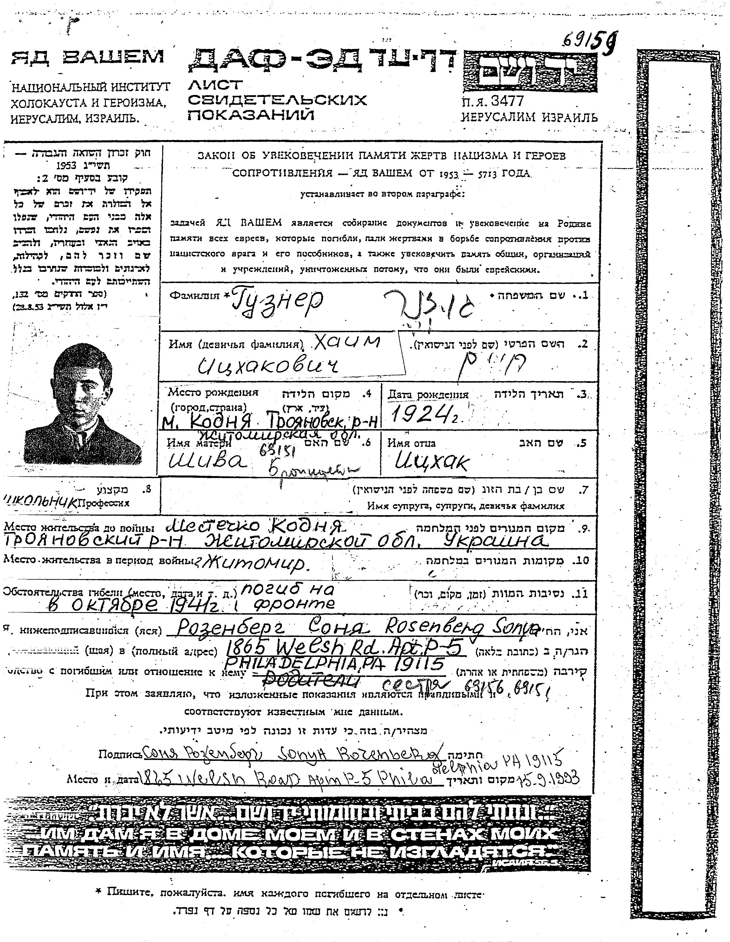 Khaim Guzner was born in Kodnya, Ukraine (USSR), 1924. He was a pupil. Prior to WWII he lived in Kodnya, Ukraine (USSR). Khaim was killed in military service in WWII. Place of death: unstated place, 1941.