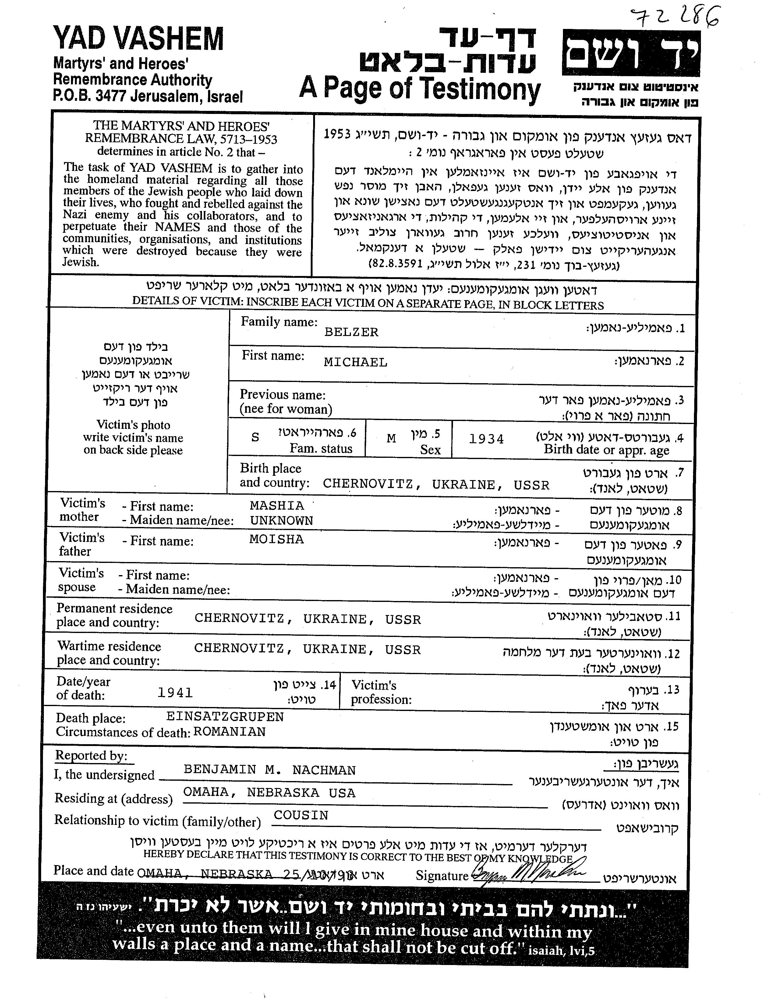Belzer Belcher Michael 1934 Czernowitz, Romania Page of Testimony