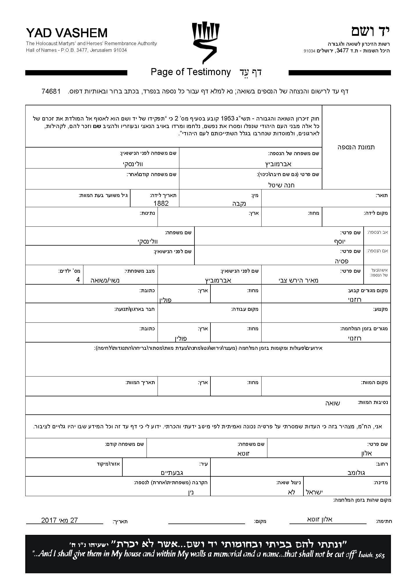 Abramovitz Khana Sheitel 1882 Ruzany, Poland Page of Testimony (digital)
