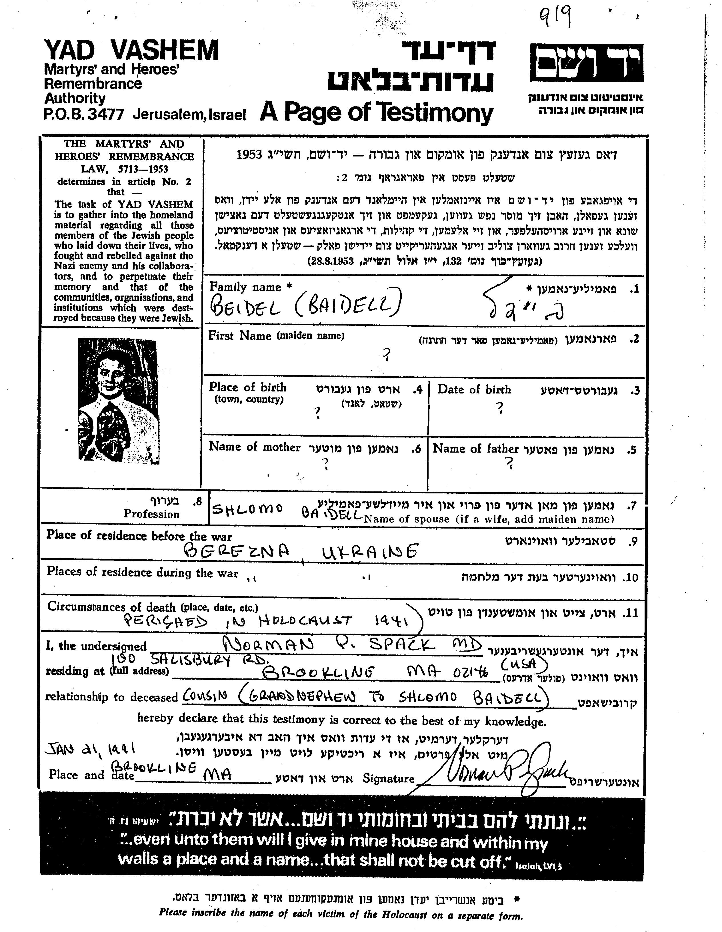 Beidel | First name unknown | Berezna, Ukraine (USSR) | Page of Testimony | |