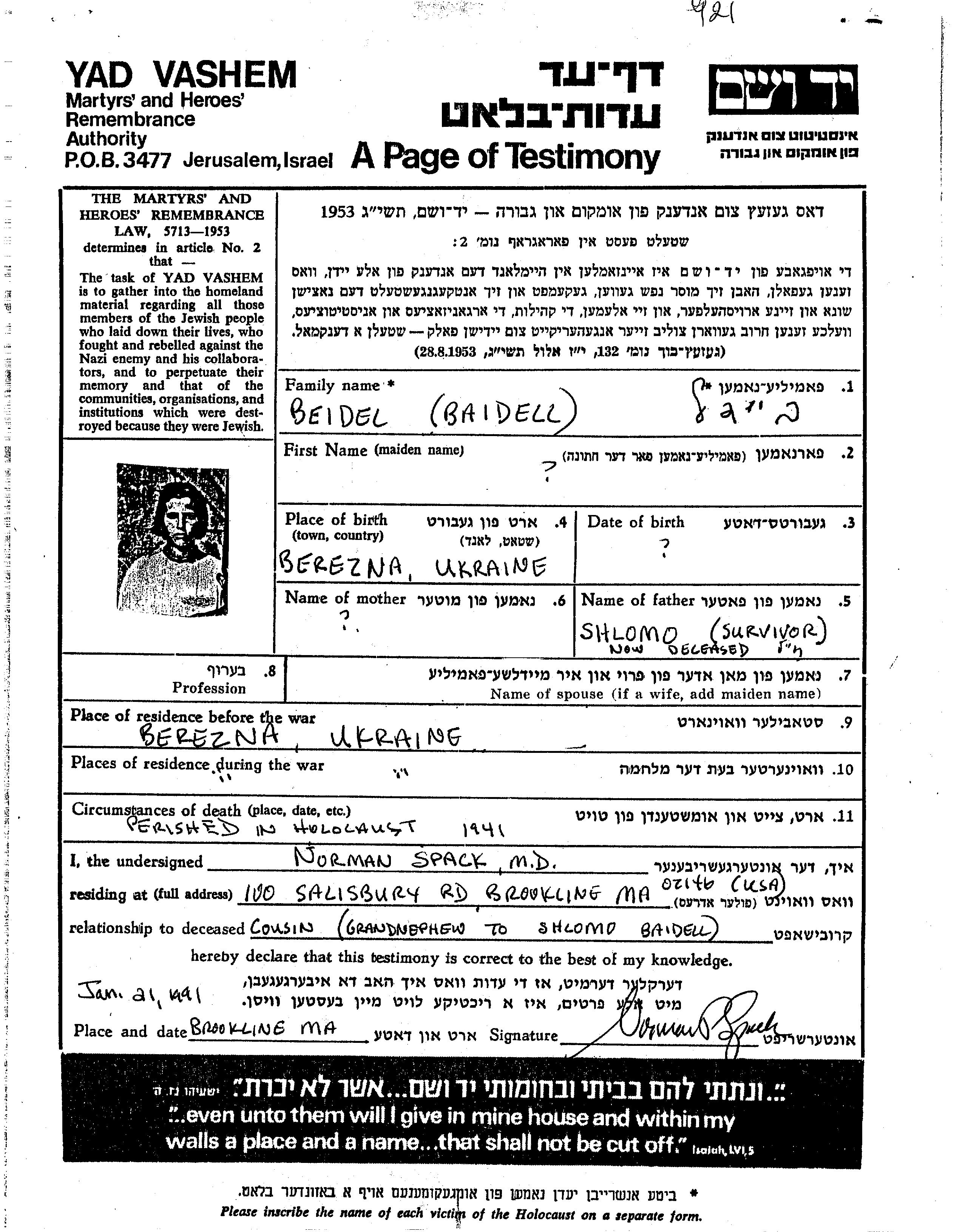 Beidel First name unknown Berezna, Ukraine (USSR) Page of Testimony