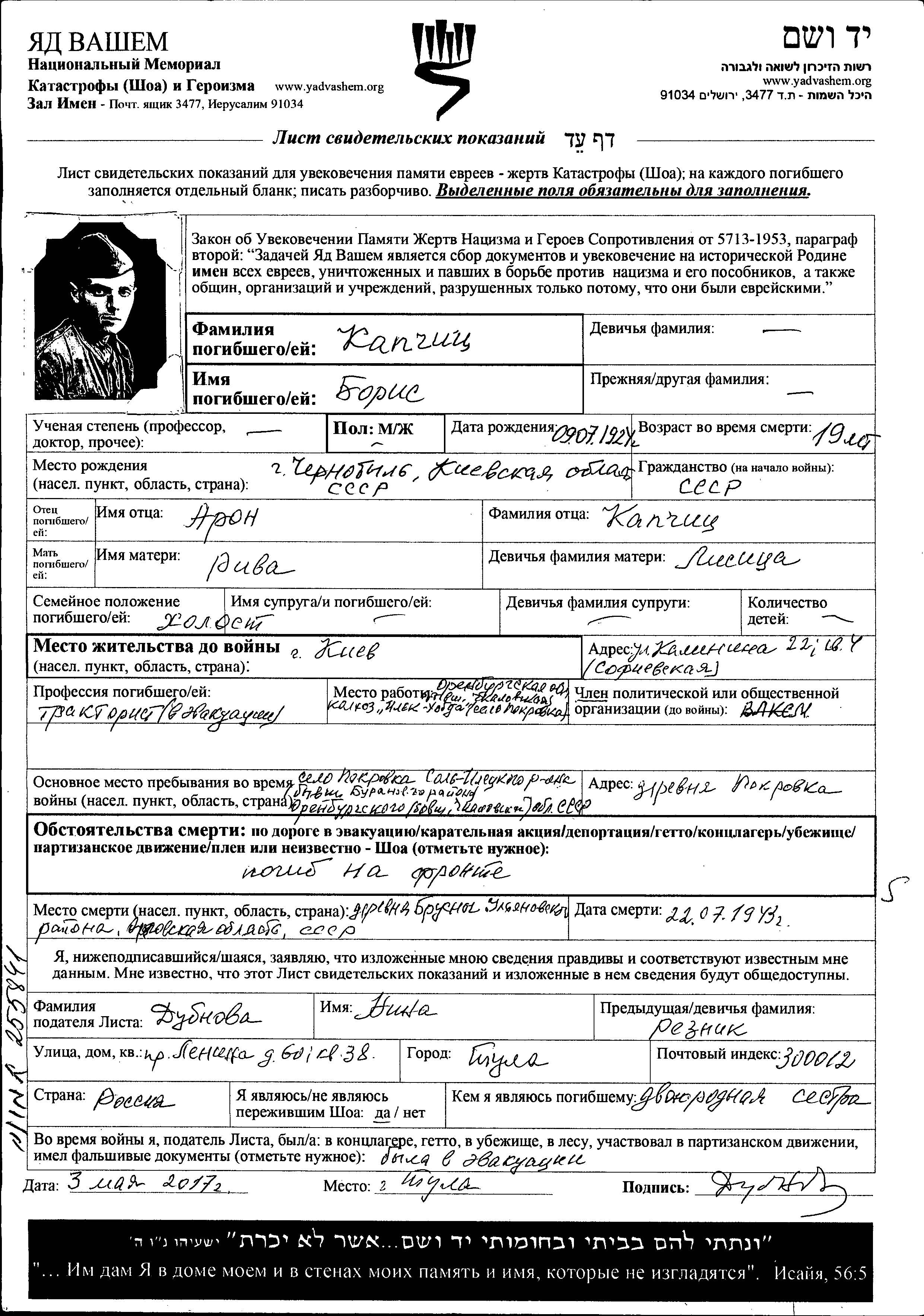 Boris Kapchitz was born in Chernobyl, Ukraine (USSR), 1924. He was a tractor driver. Prior to WWII he lived in Kiev, Ukraine (USSR).
