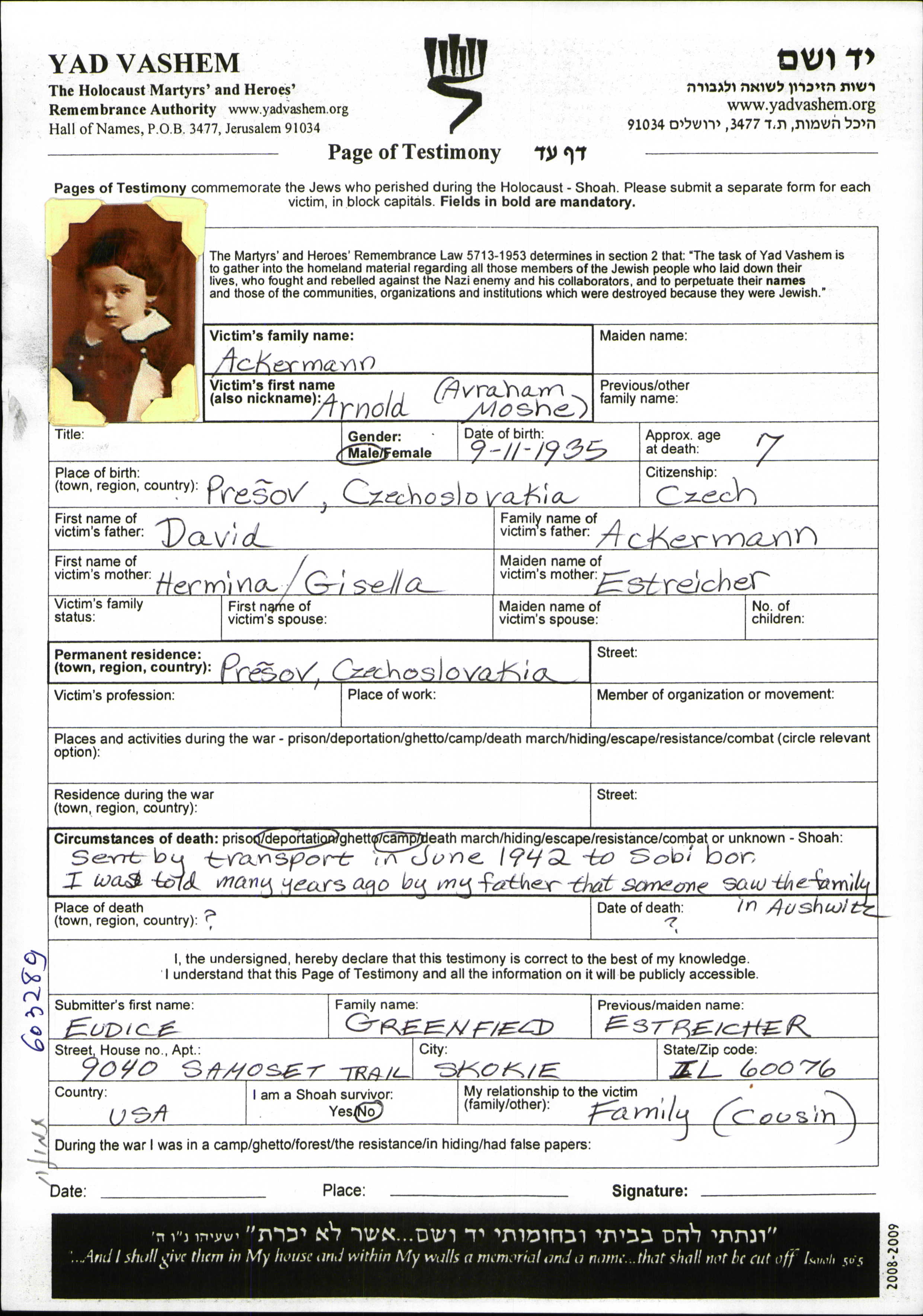 Ackermann Arnold Avraham Moshe 1935 Presov, Czechoslovakia Page of Testimony