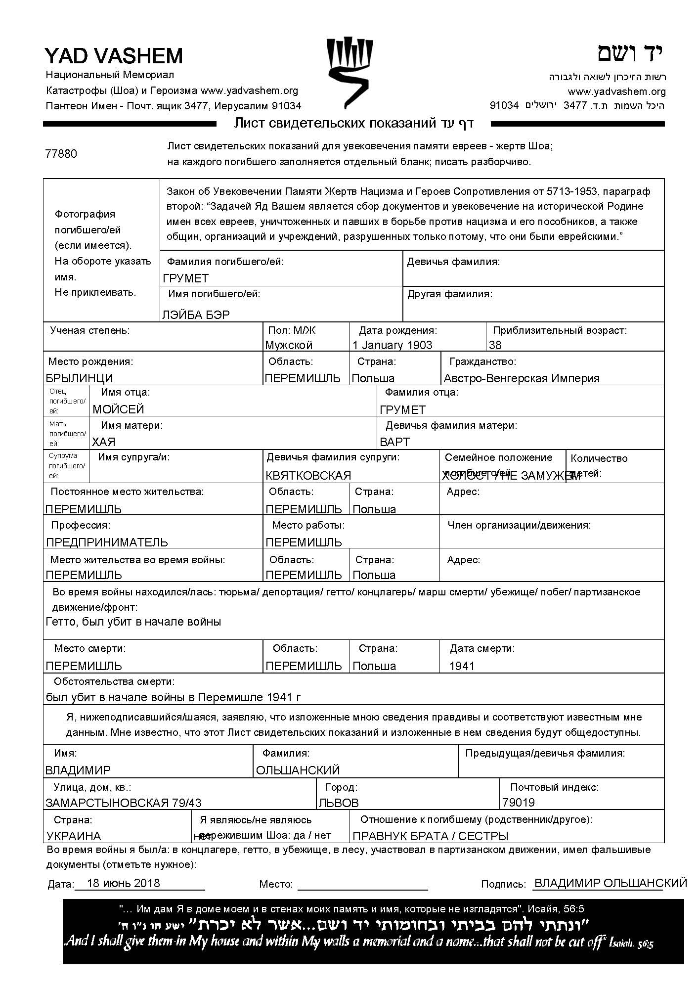 Leyba Ber Grumet was born in Brylince, Poland, 1903. He was a predprinimatel. Prior to WWII he lived in Przemysl, Poland. Leyba Ber was murdered in the Shoah. Place of death: Przemysl, Poland, 1941.