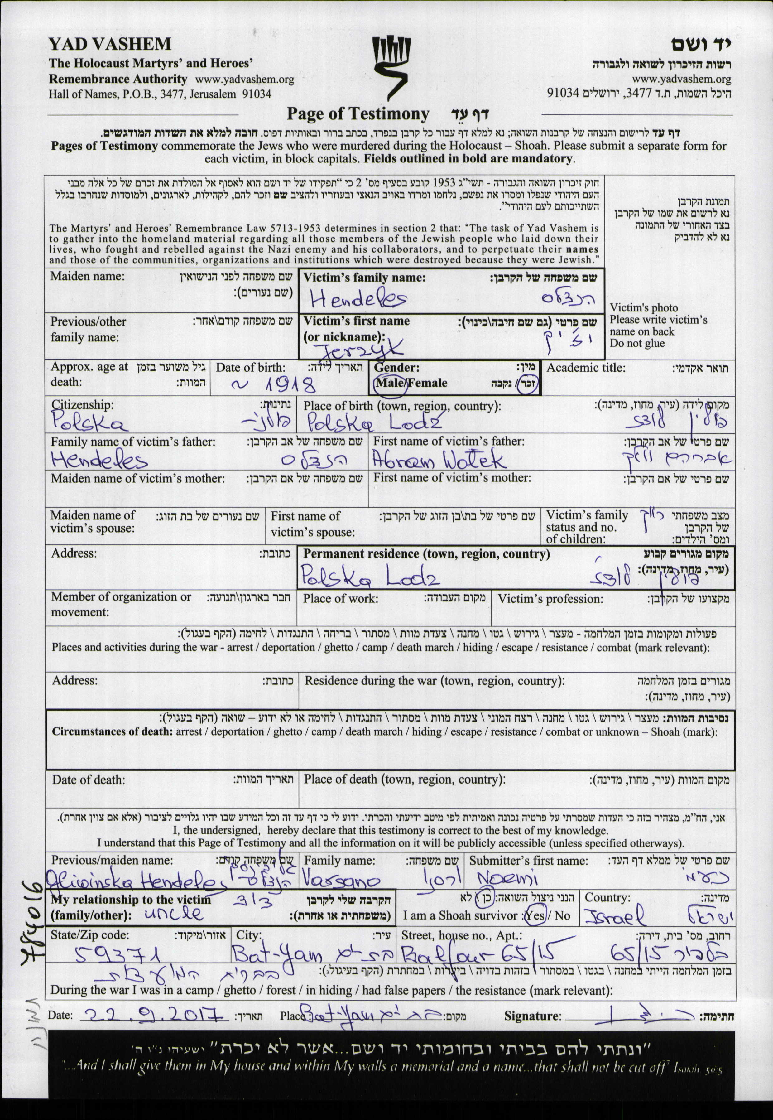 Hendeles Jerzyk Yezhik 1918 Lodz, Poland Page of Testimony