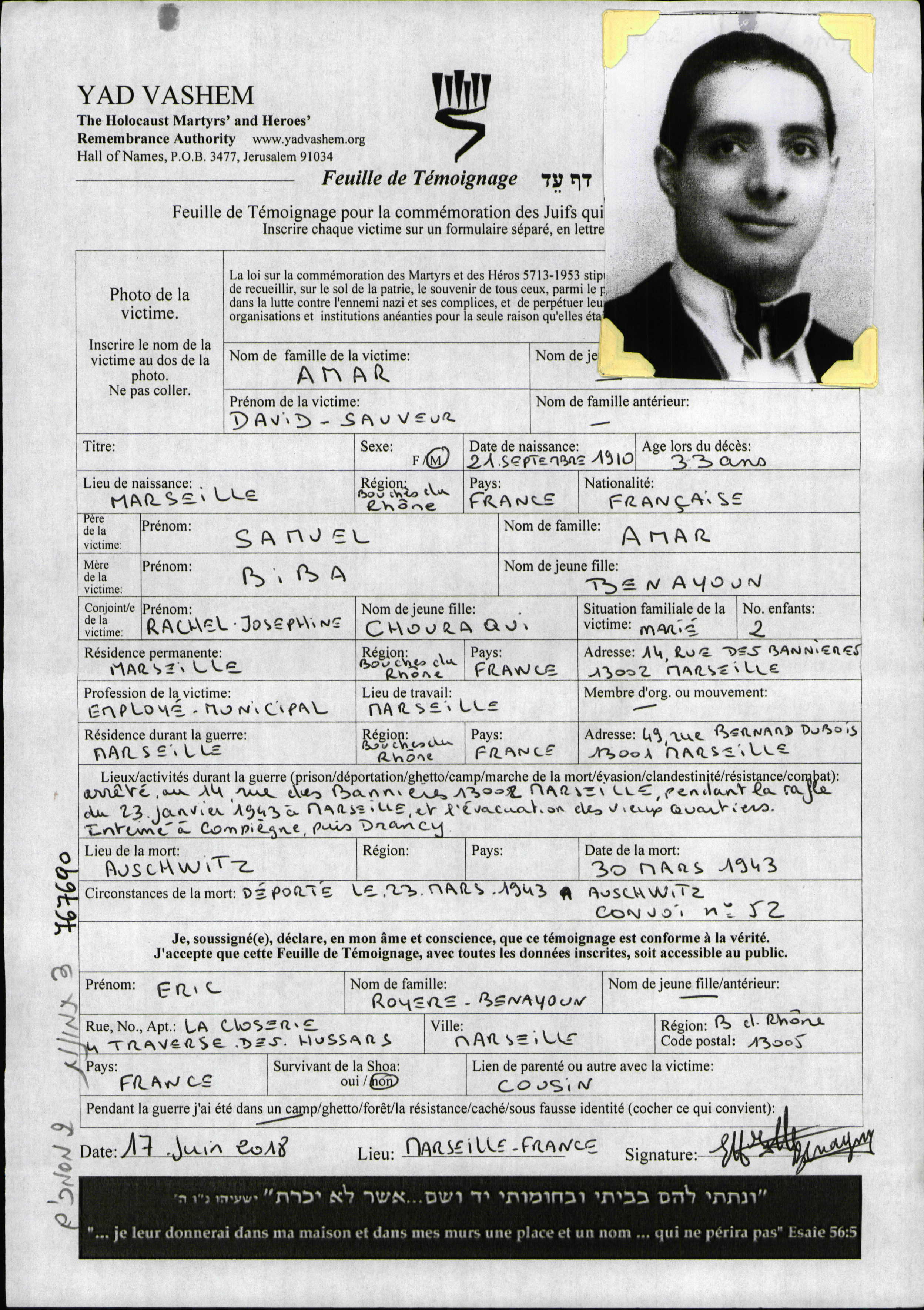 Amar David-Sauveur 1910 Marseille, France Page of Testimony