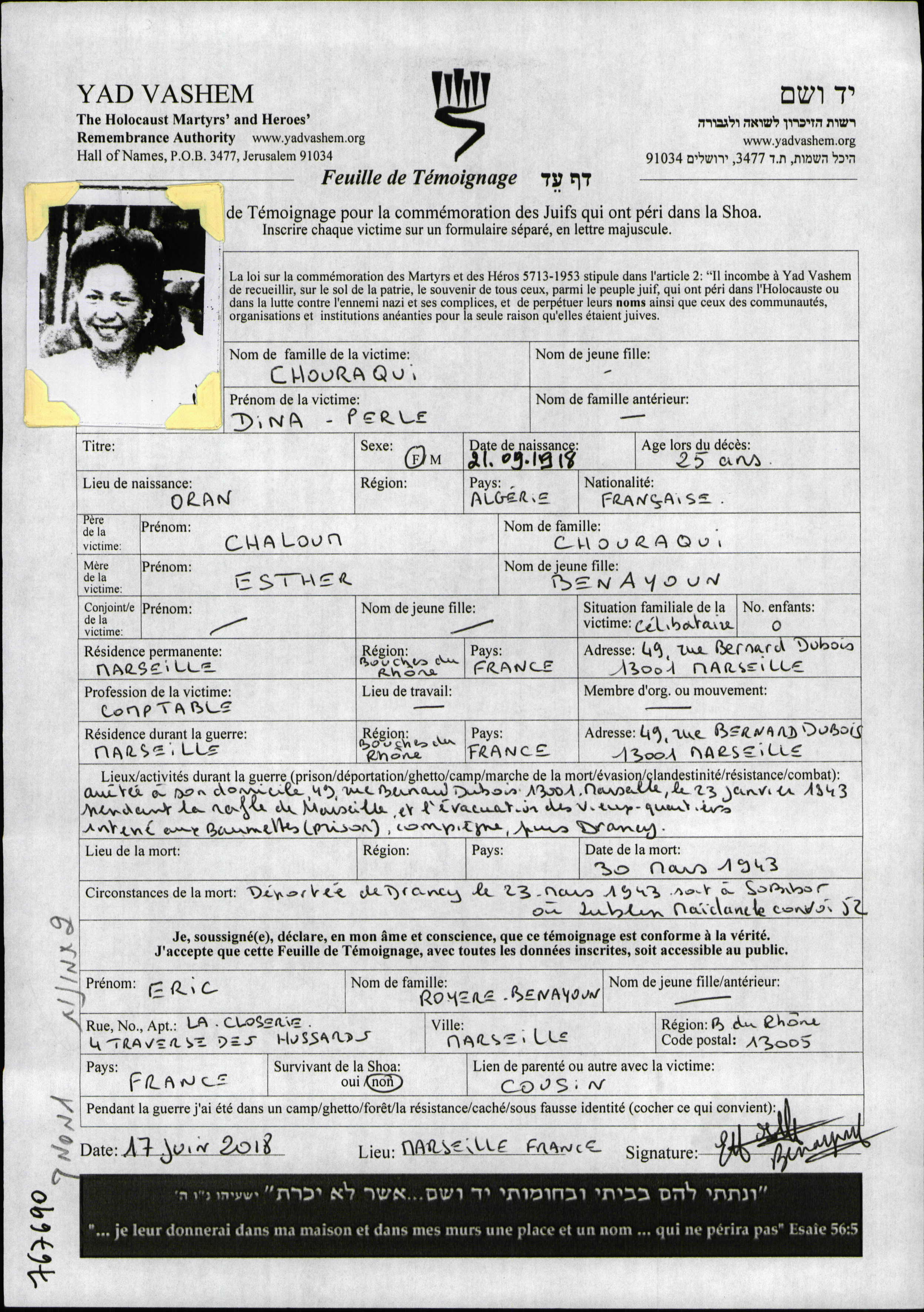 Chouraqui Dina-Perle 1918 Marseille, France Page of Testimony