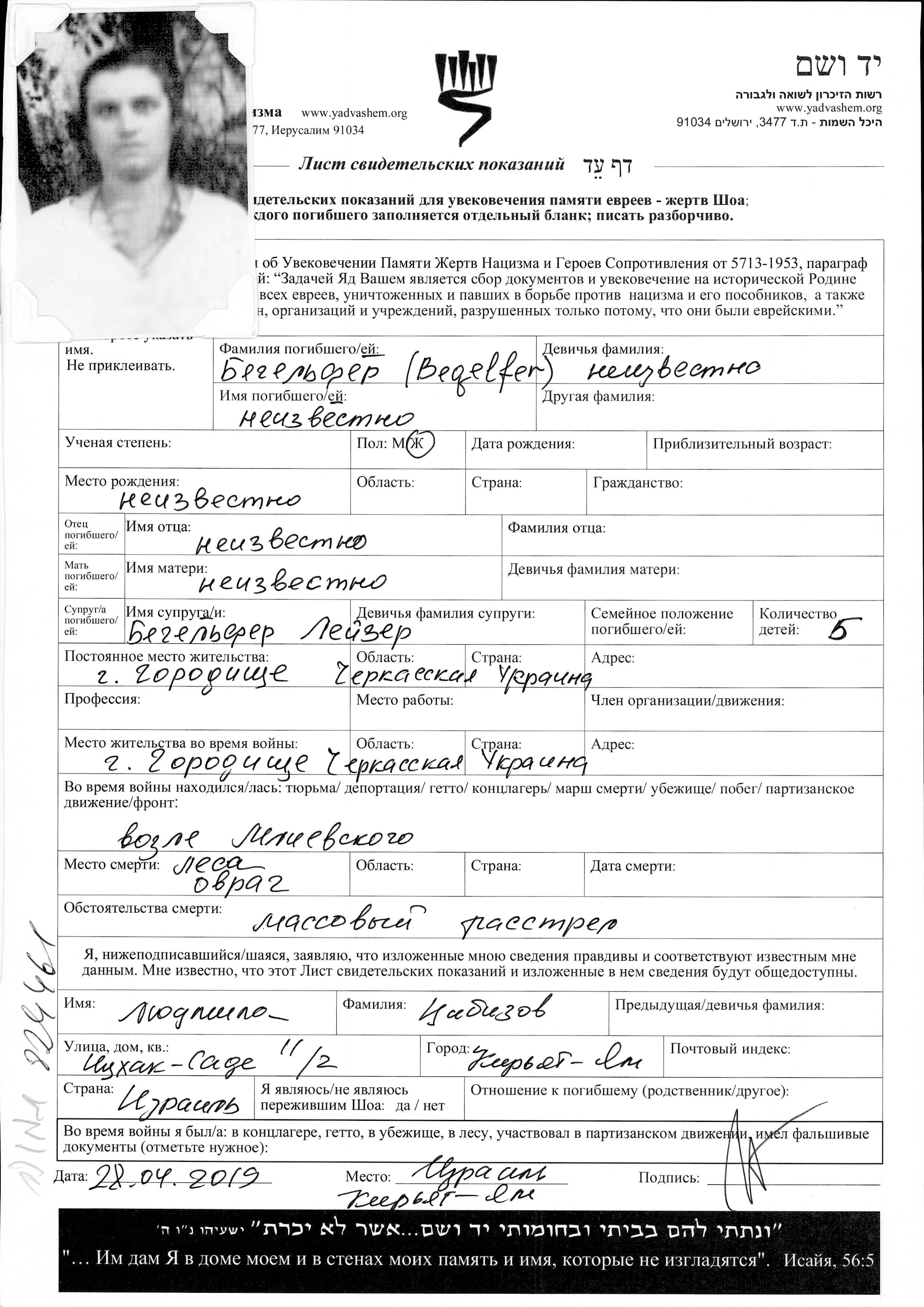 | Begelfer | First name unknown | Gorodishche, Ukraine (USSR) | Page of Testimony | |