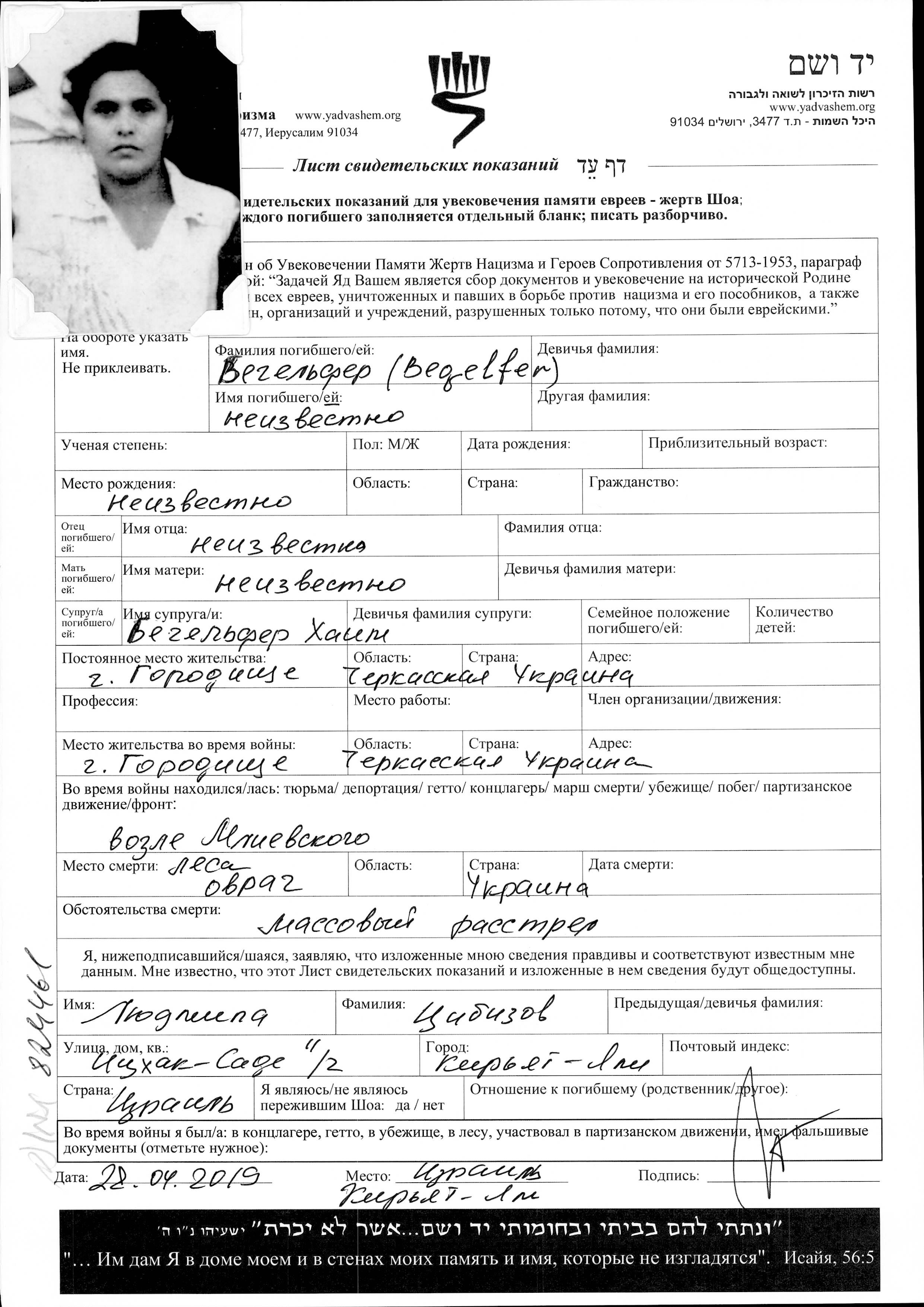 | Begelfer | First name unknown | Gorodishche, Ukraine (USSR) | Page of Testimony | |