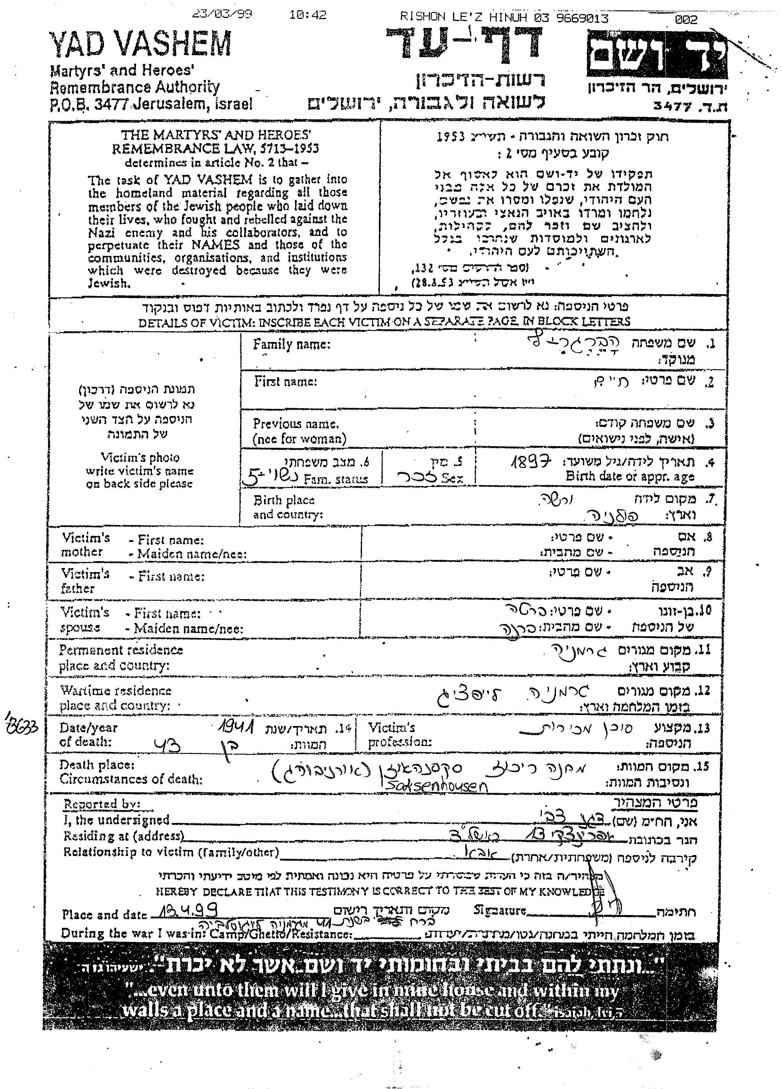 | Habergritz | Khaim | 1897 | Germany | Page of Testimony |