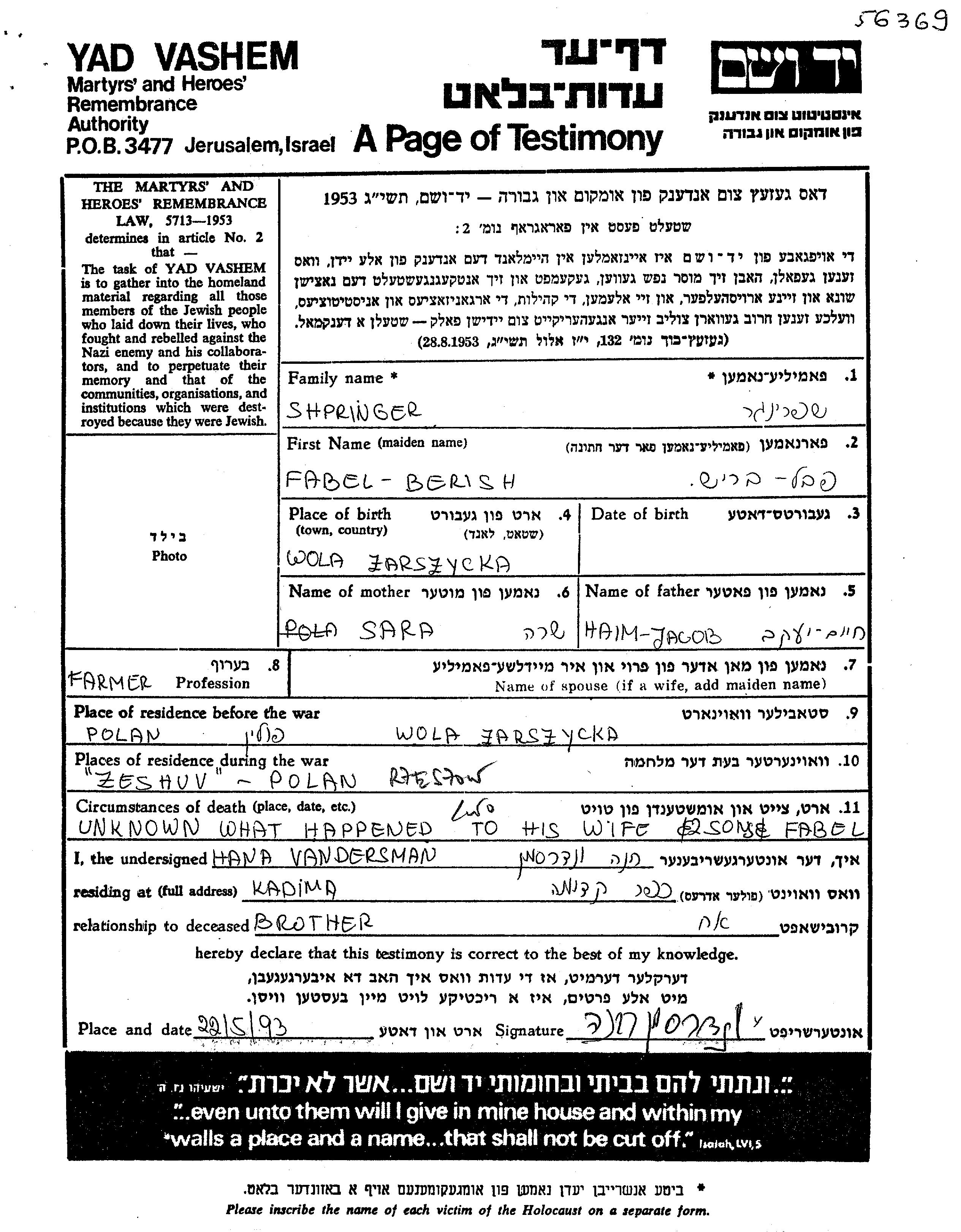Favel Pavel Berish Shpringer was born in Wola Zarczycka, Poland. He was a landowner. Prior to WWII he lived in Wola Zarczycka, Poland. Favel Pavel Berish was murdered in the Shoah. Place of death: Lwow, Poland.