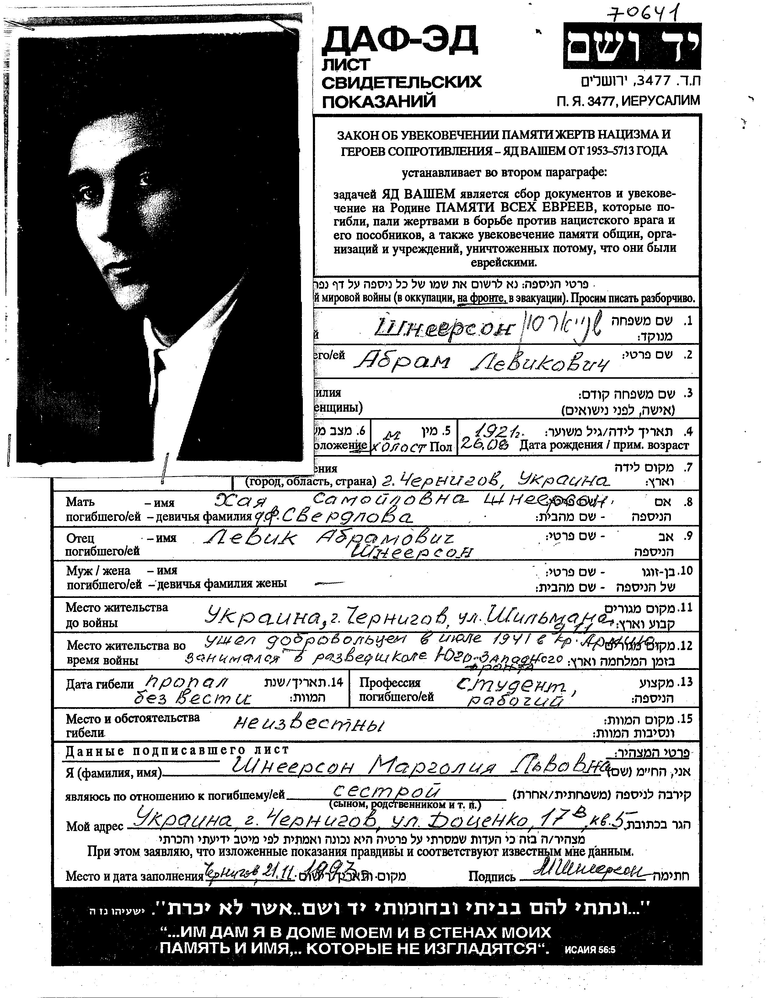 Shneyerson | Abram | 1921 | Chernigov, Ukraine (USSR) | Page of Testimony |