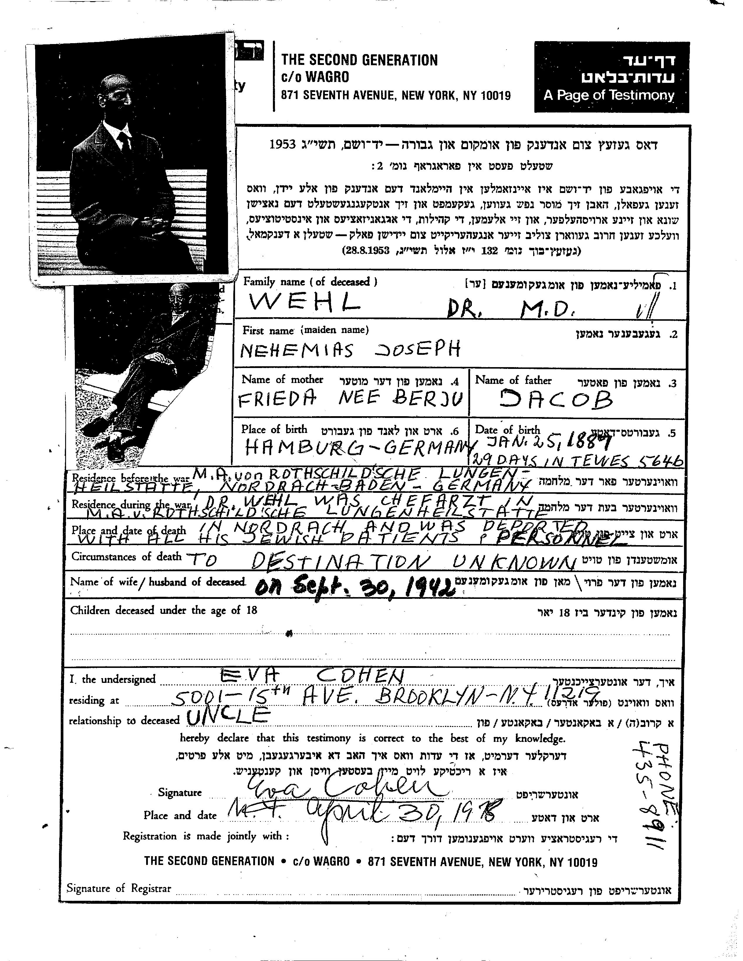 Wehl Nehemias Joseph 1887 Nordrach, Germany Page of Testimony