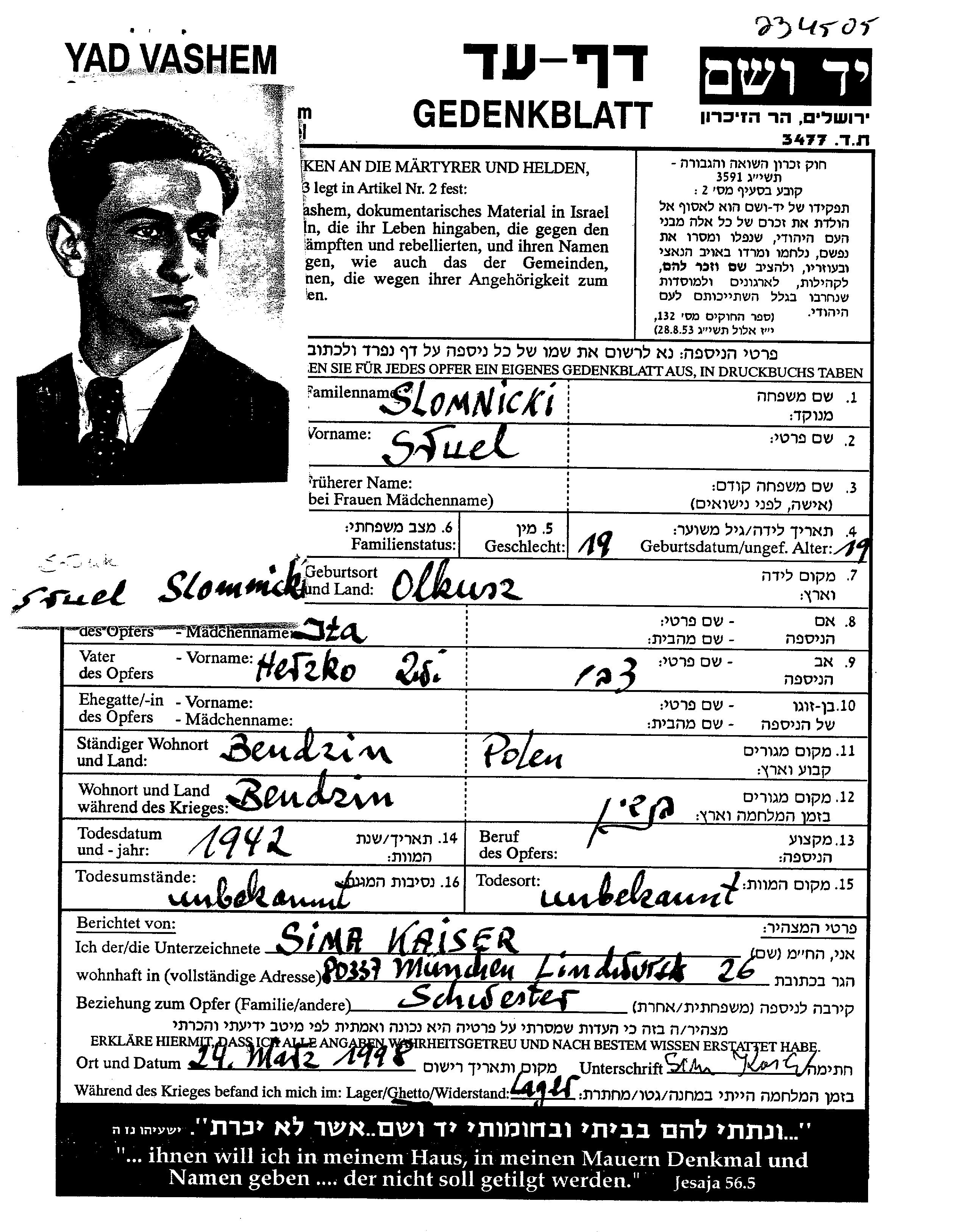 Slomnicki Sruel Będzin, Poland Page of Testimony