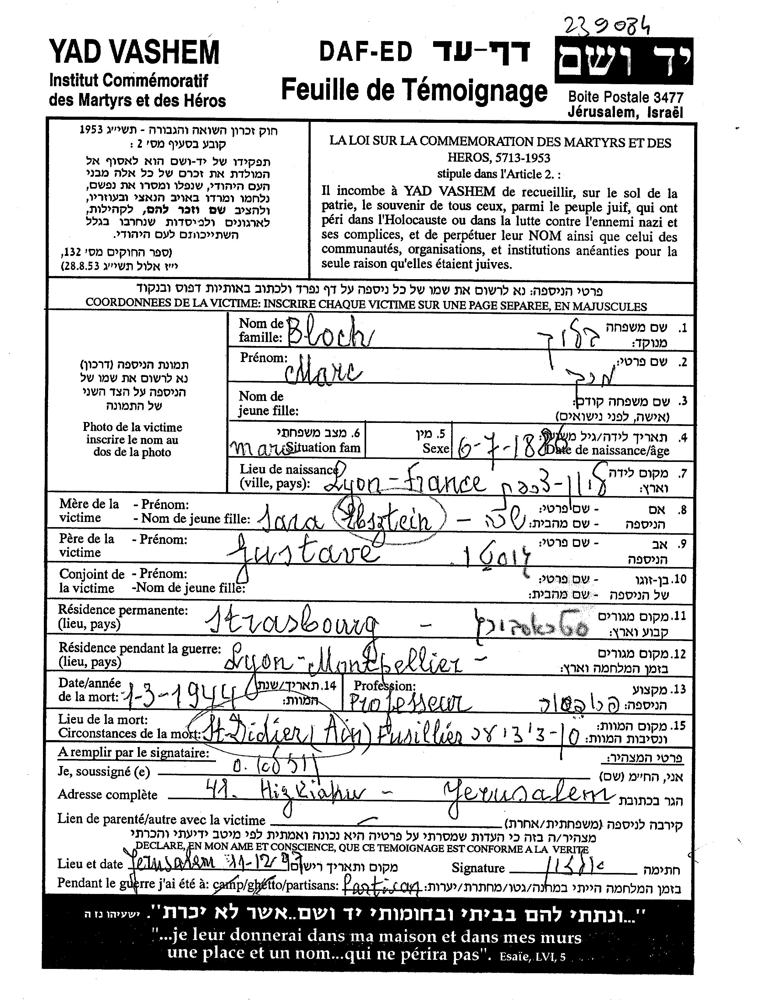 Mark Bloch was born in Lyon, France, 1886. He was a professor. Prior to WWII he lived in Strasbourg, France.