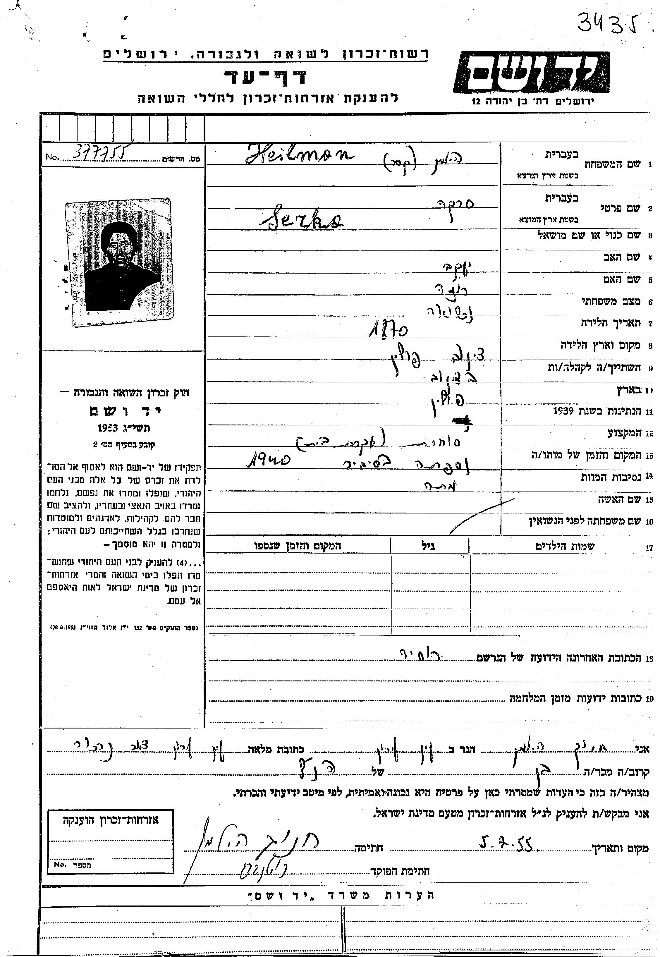 Serka Heilman Hilman nee Kaser was born in Dynow, Poland, 1870. She was a merchant. Prior to WWII she lived in Dynow, Poland.