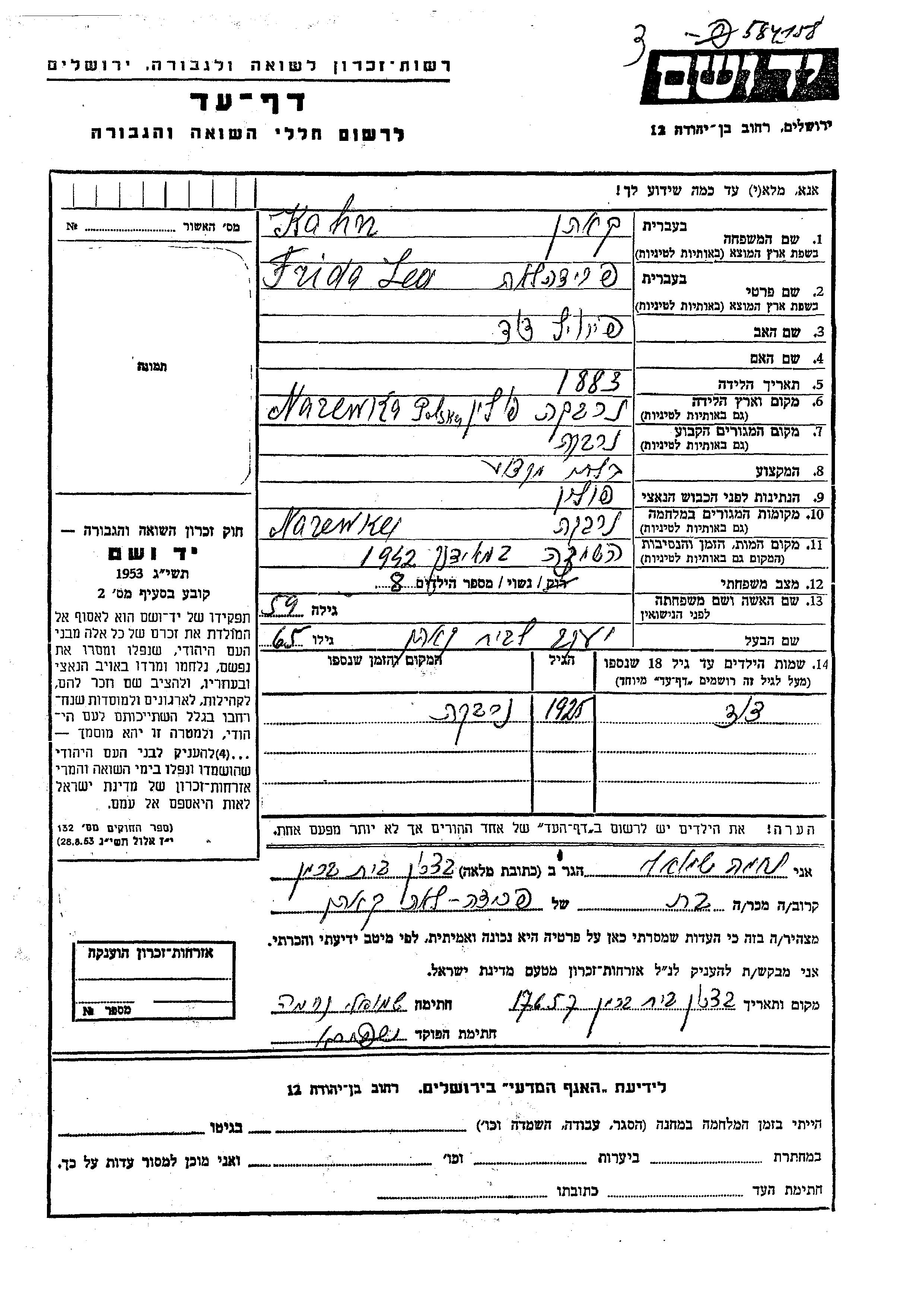| Kahn Kohen | Frida Lea | 1883 | Narewka, Poland | Page of Testimony |