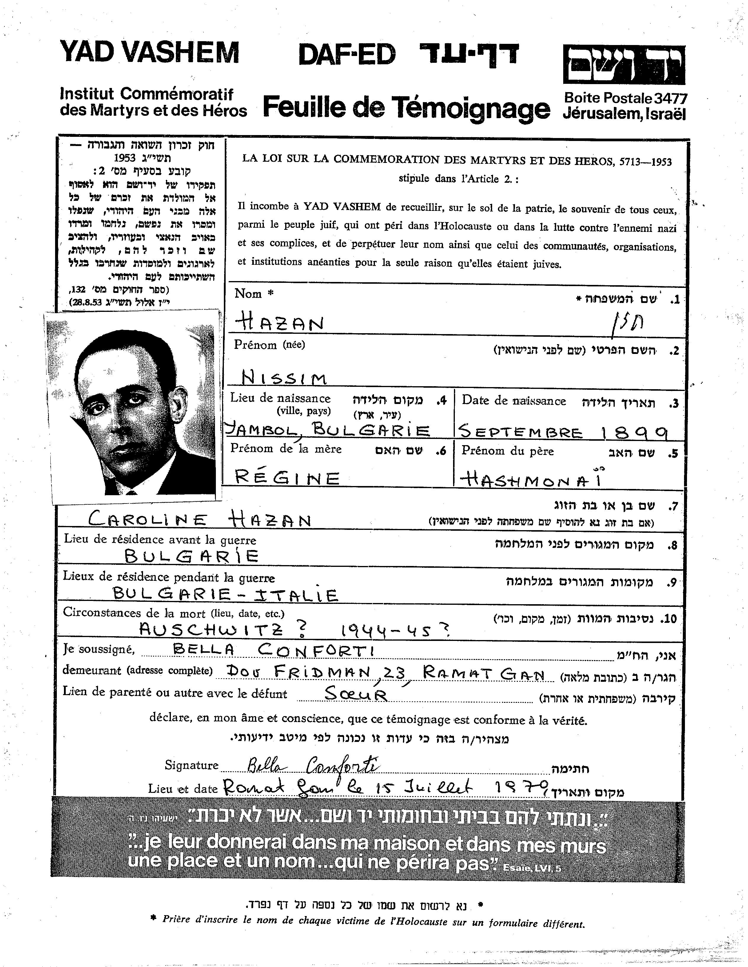 Hazan Nissim 1899 Bulgaria Page of Testimony