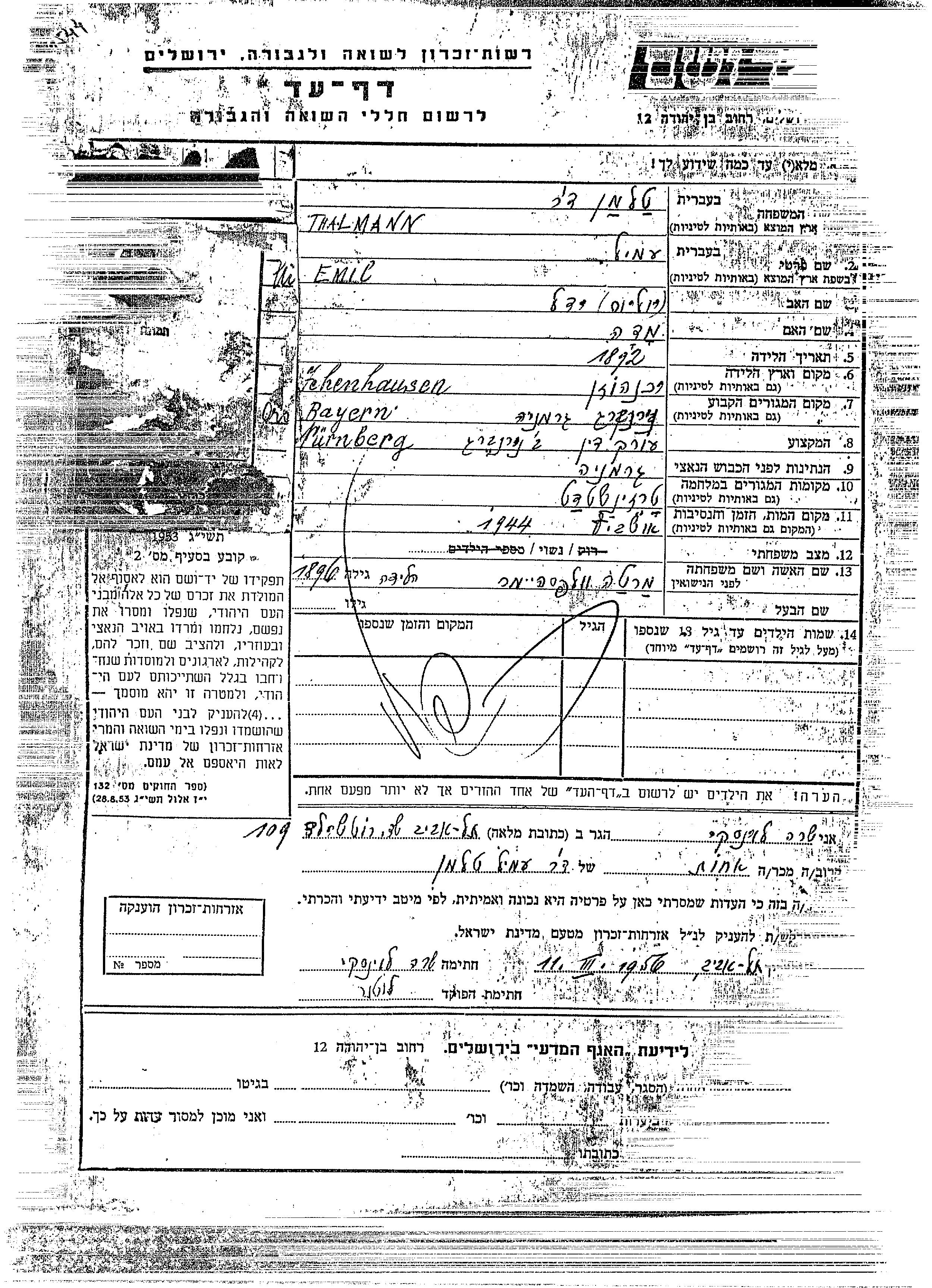 Emil Thalmann was born in Eichenhausen, Germany, 1892. He was a lawyer. Prior to WWII he lived in Nuernberg, Germany.
