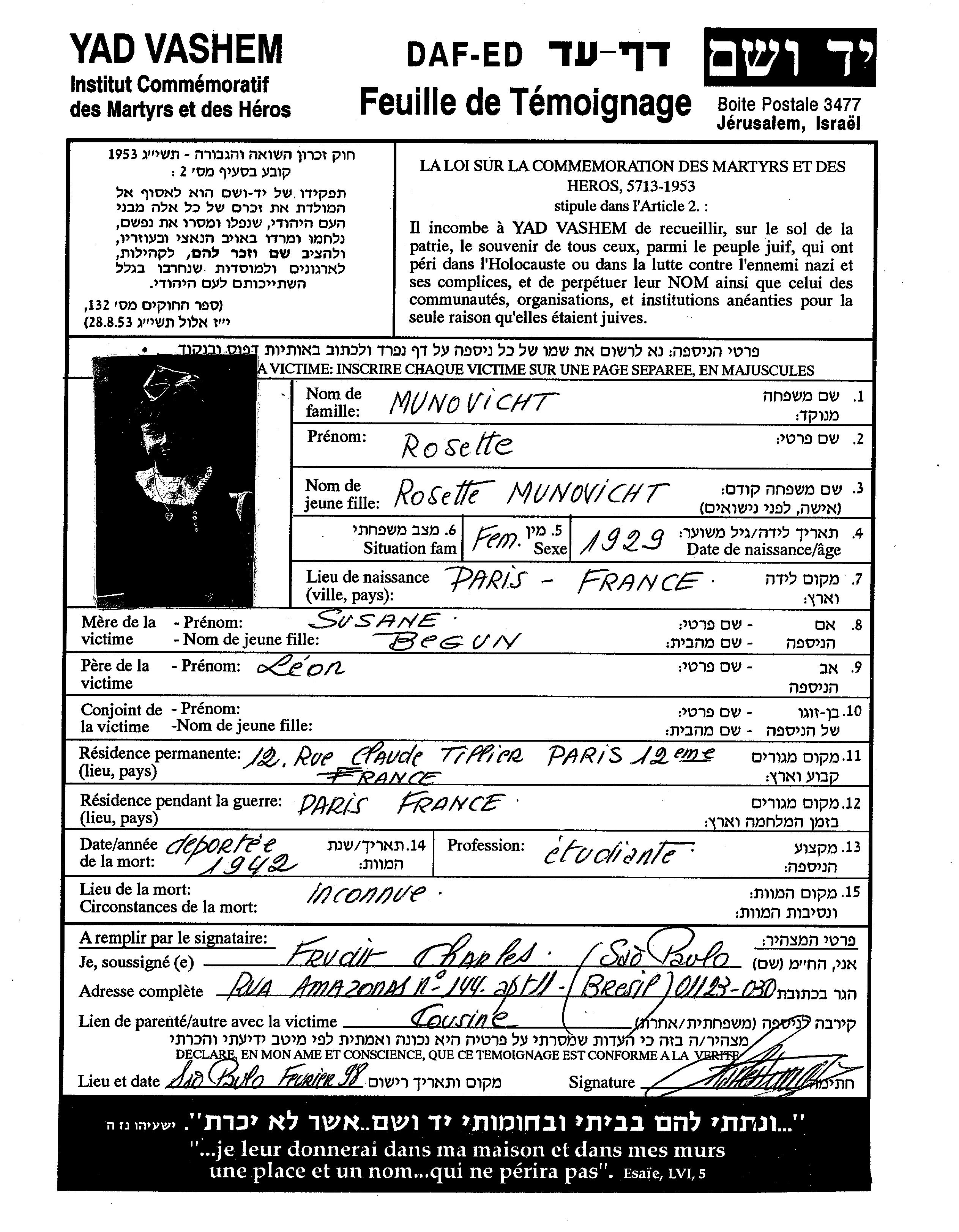 Munovicht Rosette 1929 Paris, France Page of Testimony